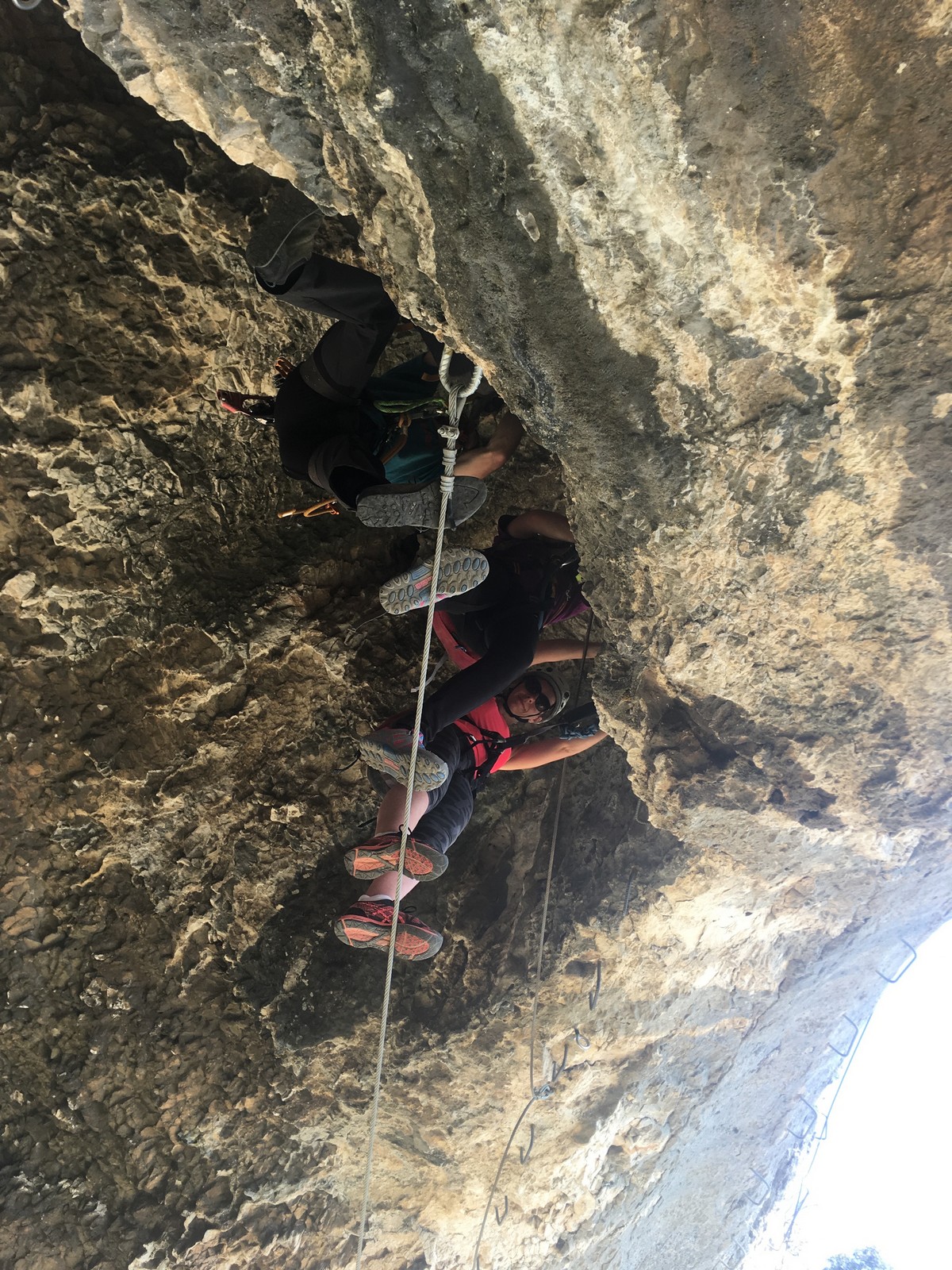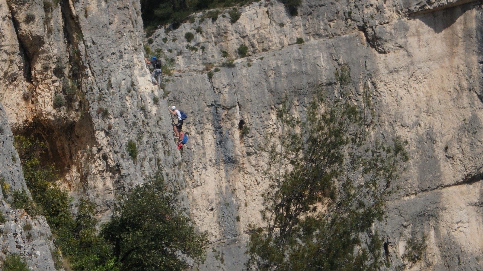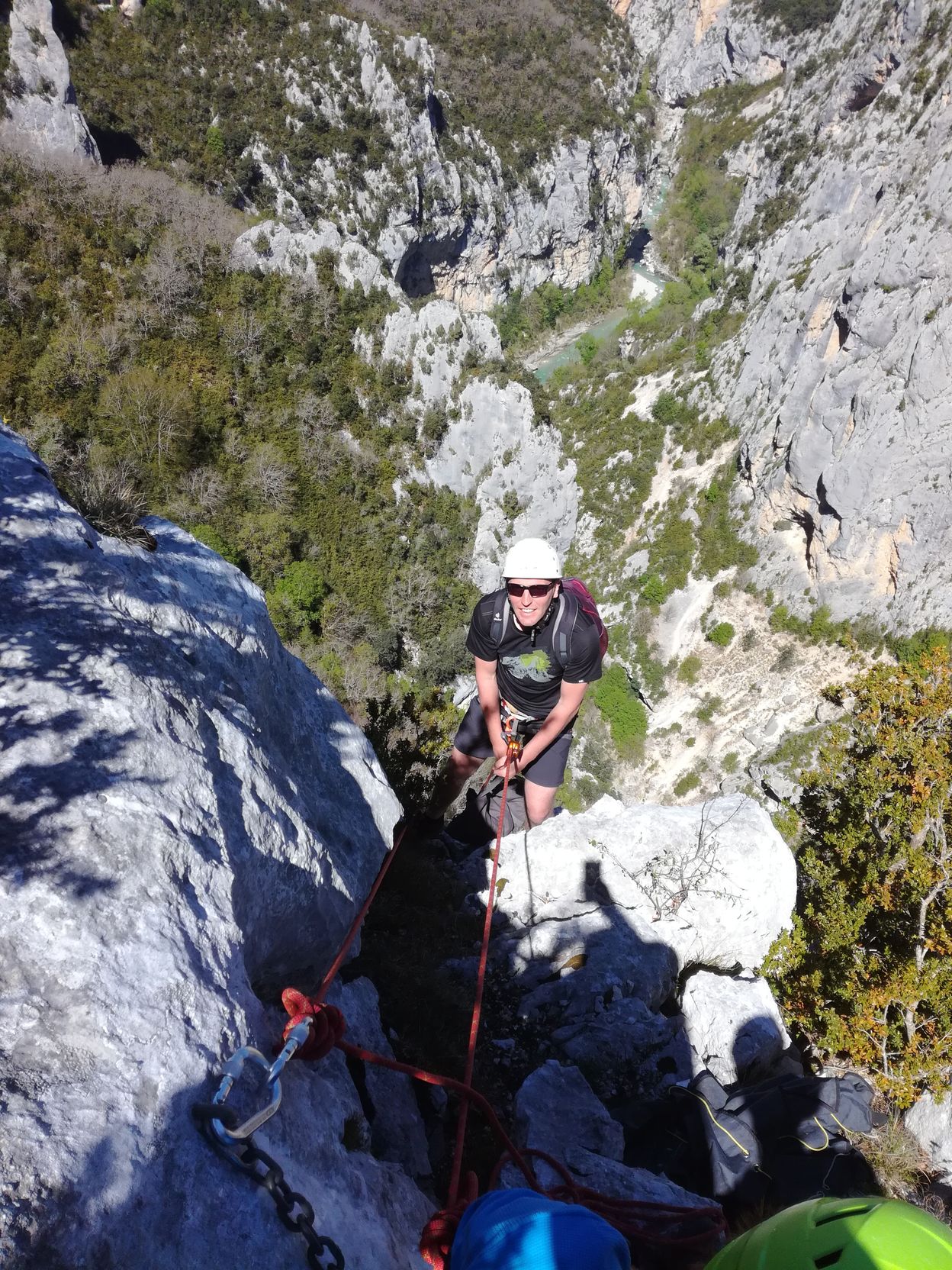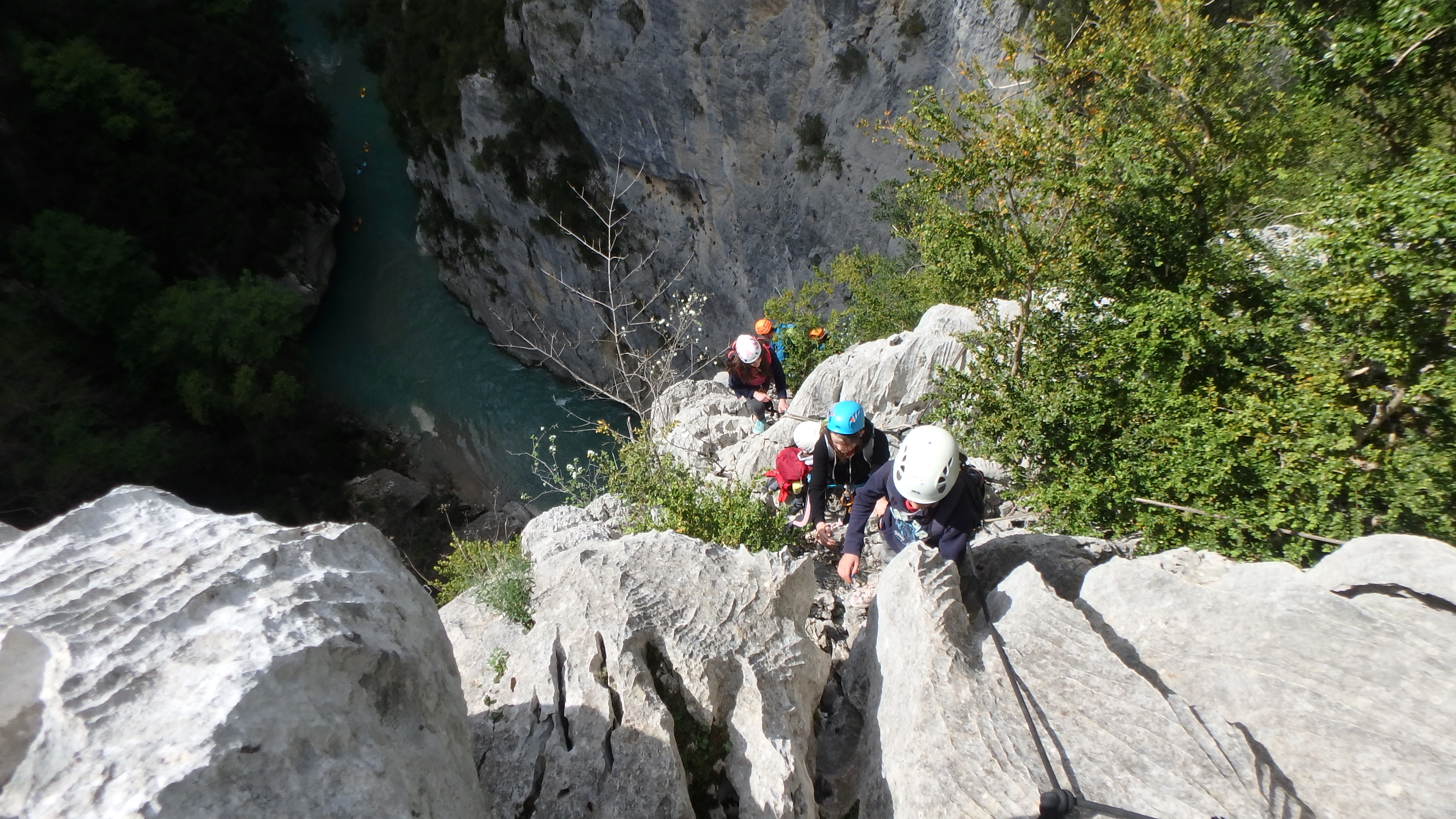 Mais la journée est loin d’être terminée, puisqu’il s’agit maintenant de remonter tout ce que l’on vient de descendre ! Pour cela, on retrouve une via-corda avec des airs de grande voie, des passages bien gazeux et une ambiance Verdon garantie. Bref, dément malgré l’équipement un peu limite, des cordes usées jusqu’à l’âme et des amarrages d’une époque incertaine. Démarrage en fanfare pour Adrien qui décroche un morceau de rocher et se retrouve suspendu par ses longes quelques dizaines de mètres au-dessus du Verdon… mais qui gère bien son stress et aura un bon souvenir à raconter ! La remontée, longue et intense se fera tranquillement et sûrement, même pour les plus petits qui nous ont bluffés sur ce coup-là. Seul élément à déplorer : l’ambiance musicale assurée par Constant et Vincent. Barabaracuda !!