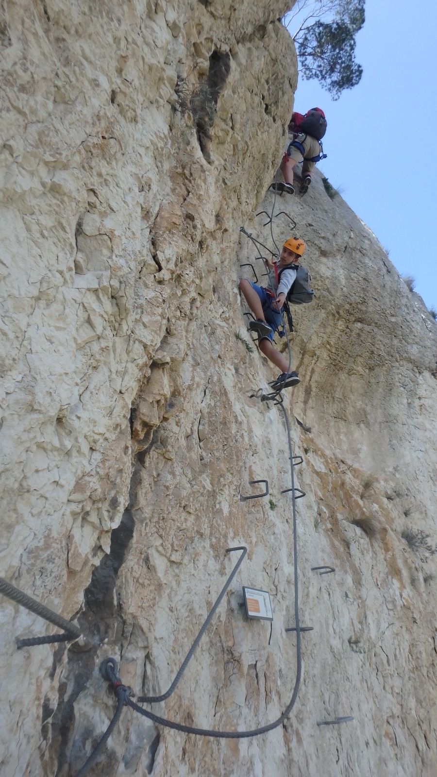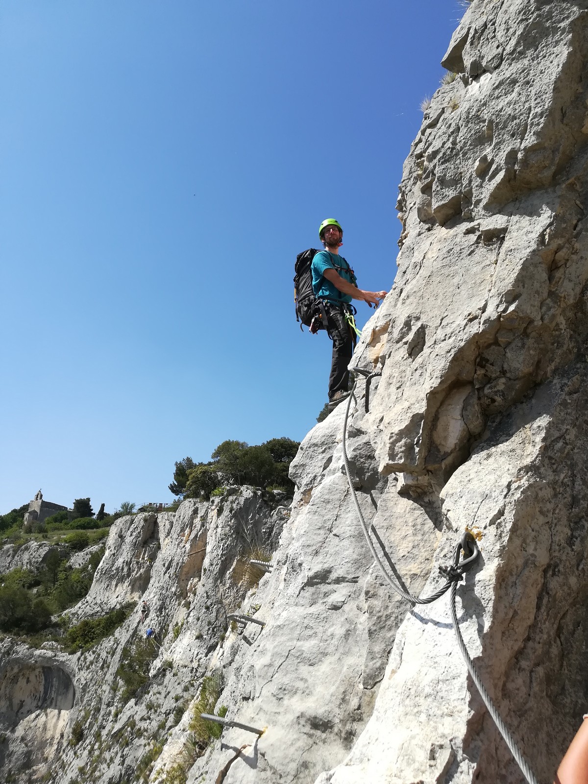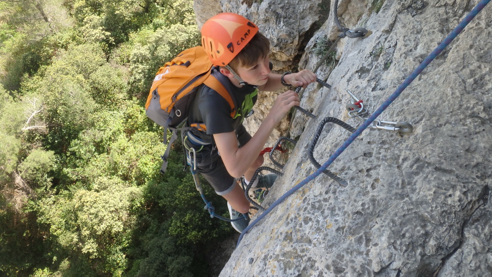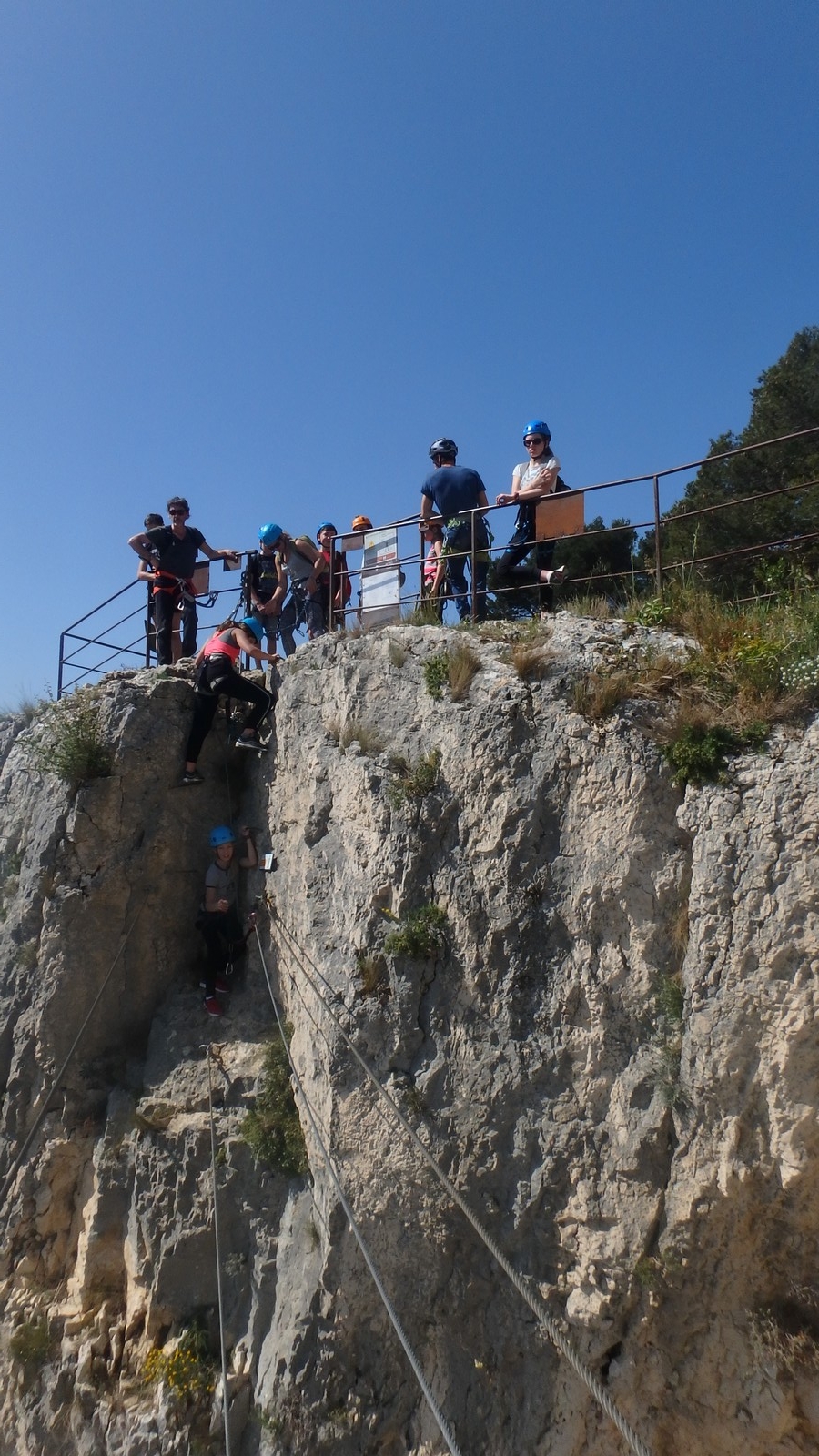 Mais la journée est loin d’être terminée, puisqu’il s’agit maintenant de remonter tout ce que l’on vient de descendre ! Pour cela, on retrouve une via-corda avec des airs de grande voie, des passages bien gazeux et une ambiance Verdon garantie. Bref, dément malgré l’équipement un peu limite, des cordes usées jusqu’à l’âme et des amarrages d’une époque incertaine. Démarrage en fanfare pour Adrien qui décroche un morceau de rocher et se retrouve suspendu par ses longes quelques dizaines de mètres au-dessus du Verdon… mais qui gère bien son stress et aura un bon souvenir à raconter ! La remontée, longue et intense se fera tranquillement et sûrement, même pour les plus petits qui nous ont bluffés sur ce coup-là. Seul élément à déplorer : l’ambiance musicale assurée par Constant et Vincent. Barabaracuda !!