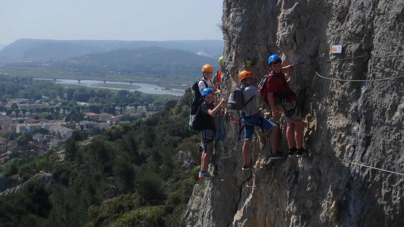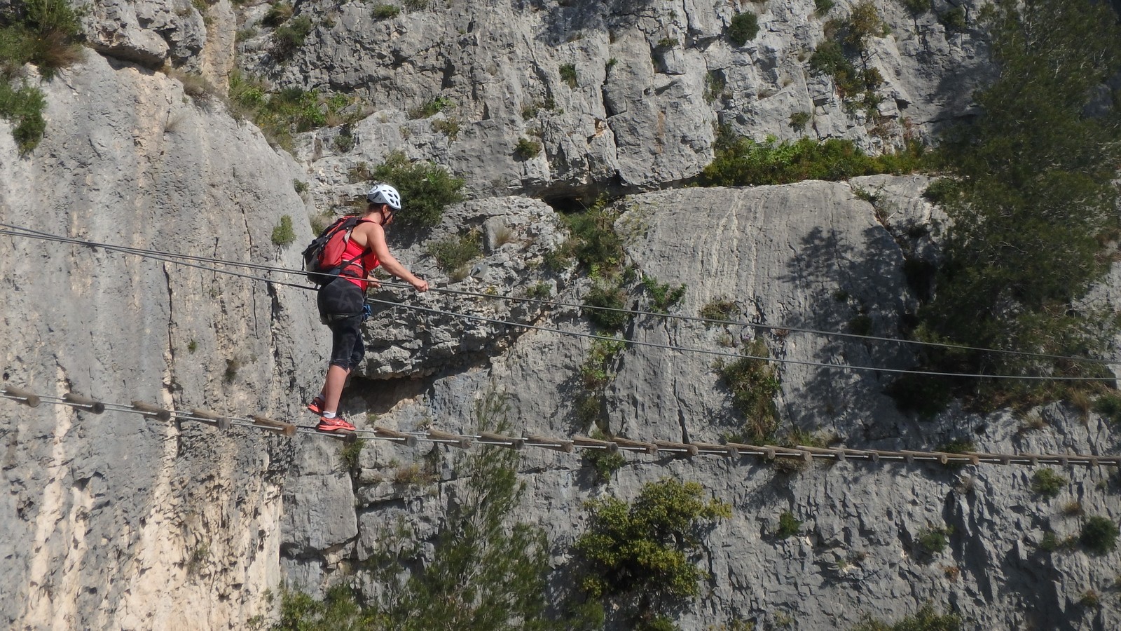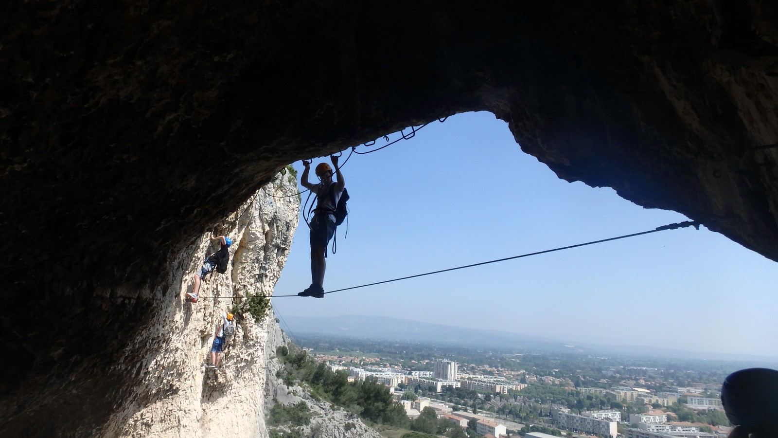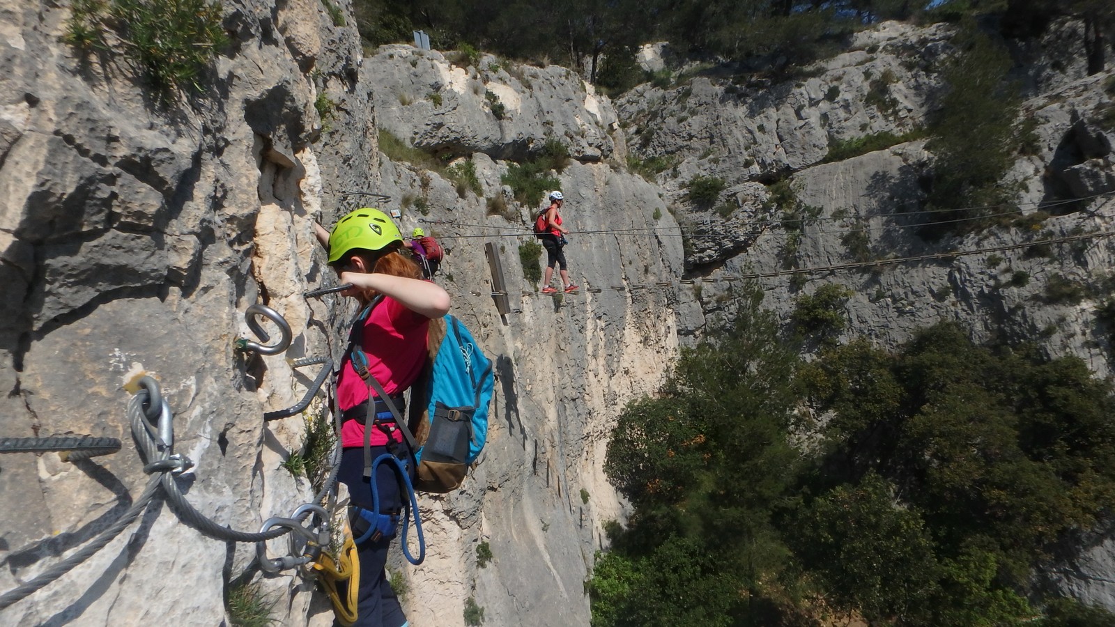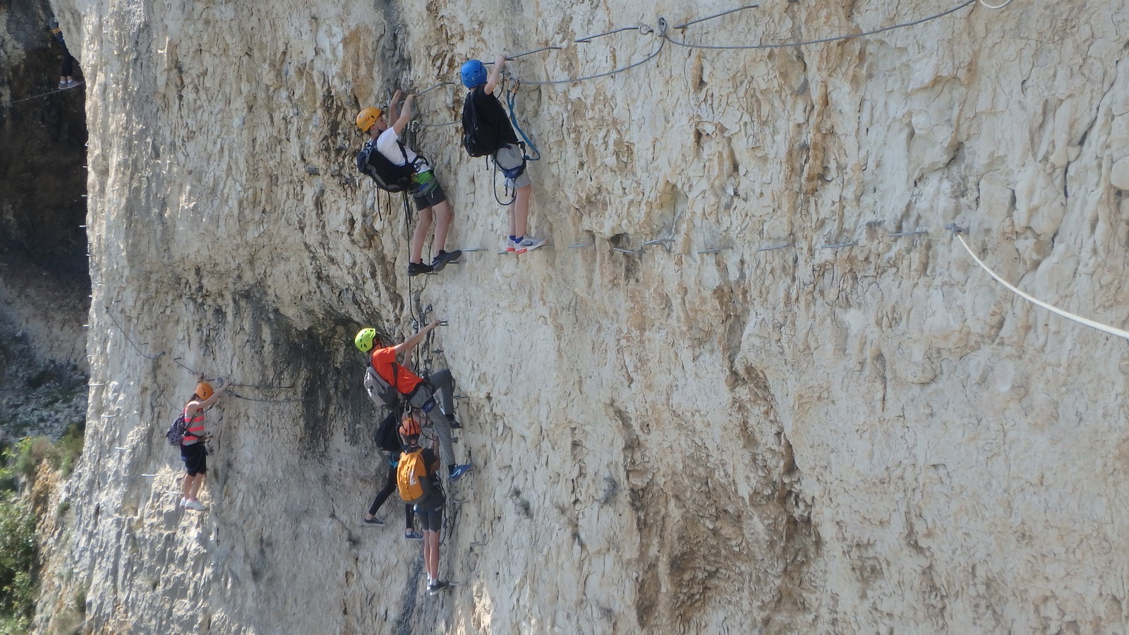 Mais la journée est loin d’être terminée, puisqu’il s’agit maintenant de remonter tout ce que l’on vient de descendre ! Pour cela, on retrouve une via-corda avec des airs de grande voie, des passages bien gazeux et une ambiance Verdon garantie. Bref, dément malgré l’équipement un peu limite, des cordes usées jusqu’à l’âme et des amarrages d’une époque incertaine. Démarrage en fanfare pour Adrien qui décroche un morceau de rocher et se retrouve suspendu par ses longes quelques dizaines de mètres au-dessus du Verdon… mais qui gère bien son stress et aura un bon souvenir à raconter ! La remontée, longue et intense se fera tranquillement et sûrement, même pour les plus petits qui nous ont bluffés sur ce coup-là. Seul élément à déplorer : l’ambiance musicale assurée par Constant et Vincent. Barabaracuda !!