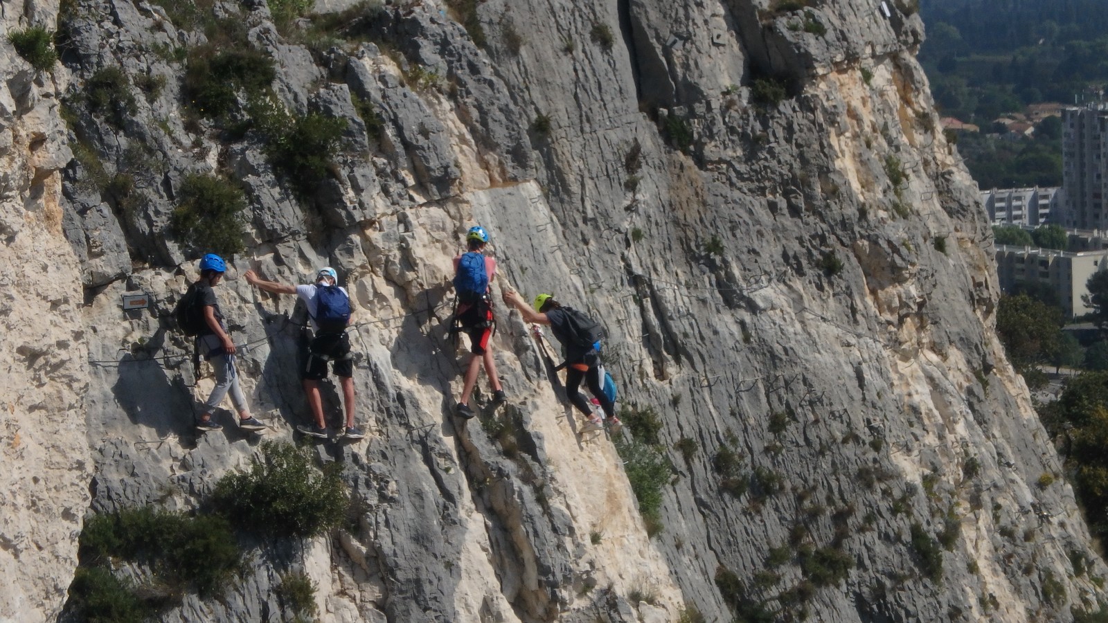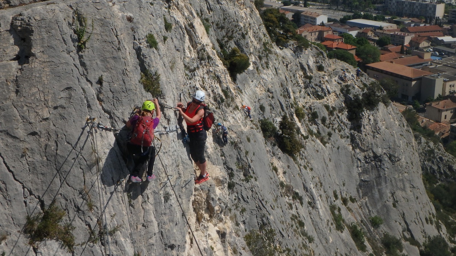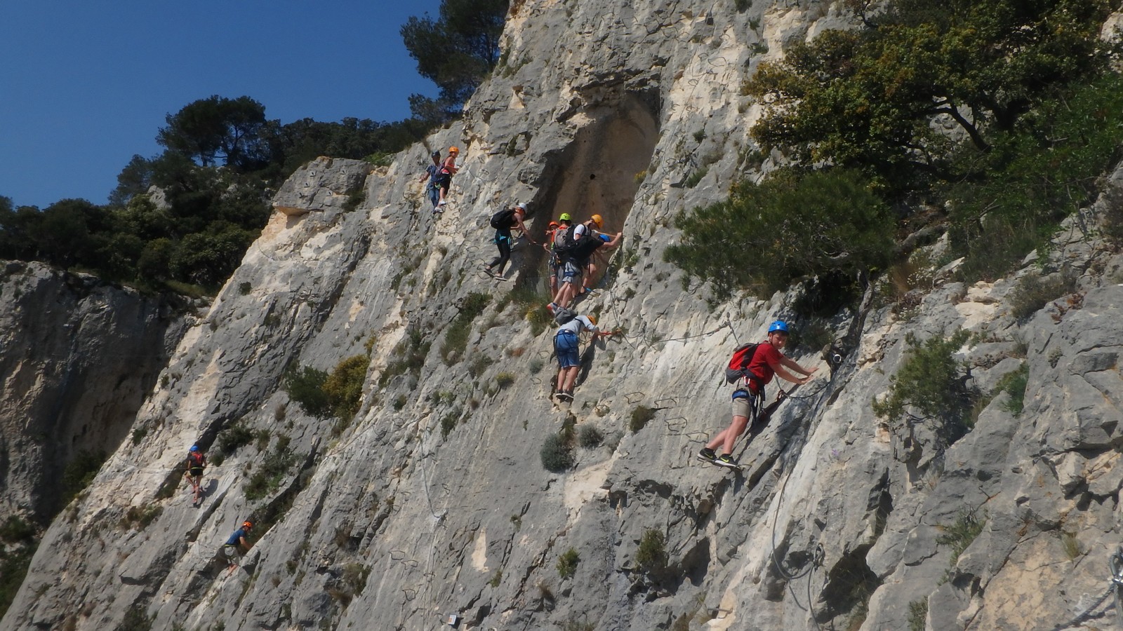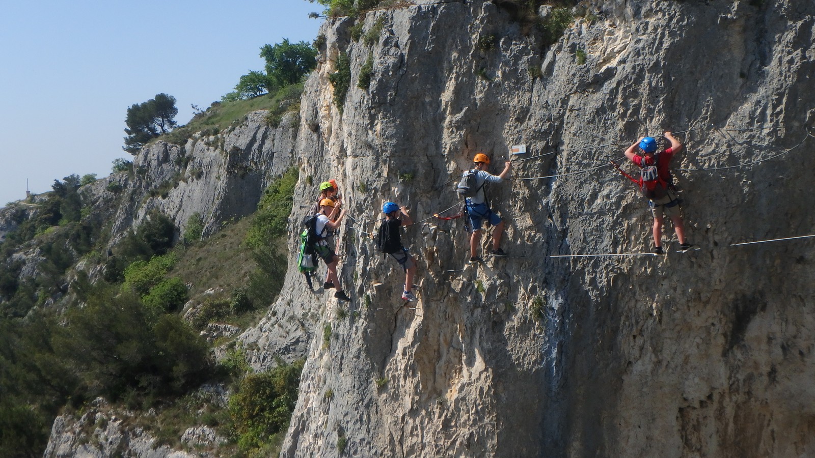 Mais la journée est loin d’être terminée, puisqu’il s’agit maintenant de remonter tout ce que l’on vient de descendre ! Pour cela, on retrouve une via-corda avec des airs de grande voie, des passages bien gazeux et une ambiance Verdon garantie. Bref, dément malgré l’équipement un peu limite, des cordes usées jusqu’à l’âme et des amarrages d’une époque incertaine. Démarrage en fanfare pour Adrien qui décroche un morceau de rocher et se retrouve suspendu par ses longes quelques dizaines de mètres au-dessus du Verdon… mais qui gère bien son stress et aura un bon souvenir à raconter ! La remontée, longue et intense se fera tranquillement et sûrement, même pour les plus petits qui nous ont bluffés sur ce coup-là. Seul élément à déplorer : l’ambiance musicale assurée par Constant et Vincent. Barabaracuda !!