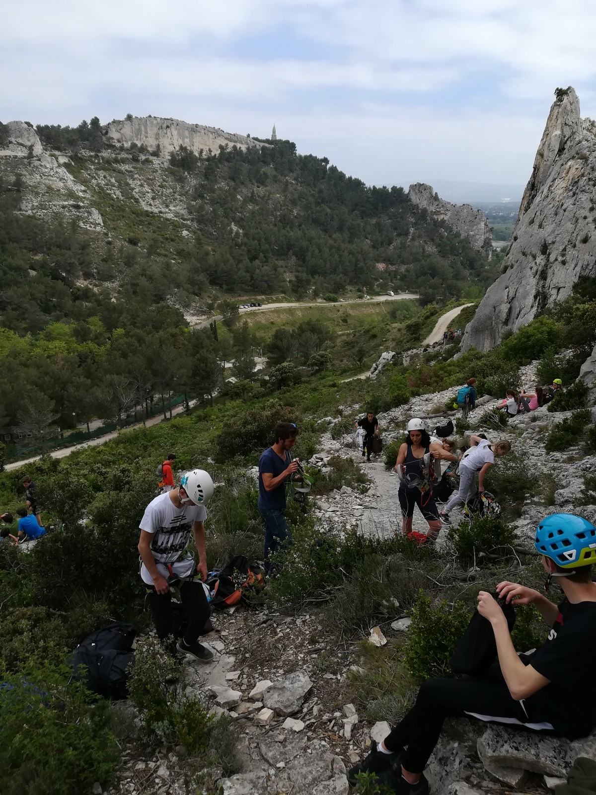 Après un nouveau « c’est pas là, on remonte dans les camions ! », et une courte marche d’approche, nous découvrons le site de grimpe qui a des airs de Bagarée, la rivière en moins. C’est un site d’initiation sans prétention, avec des prises rapportées quelque peu surprenantes, mais qui convient parfaitement pour une après-midi de (re)prise de contact avec le rocher.