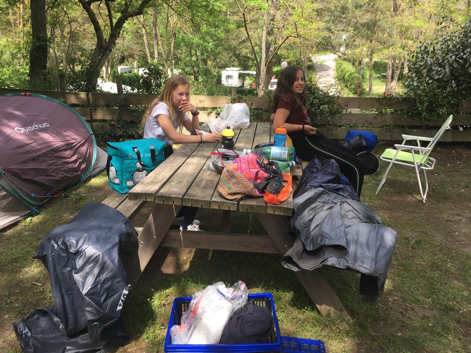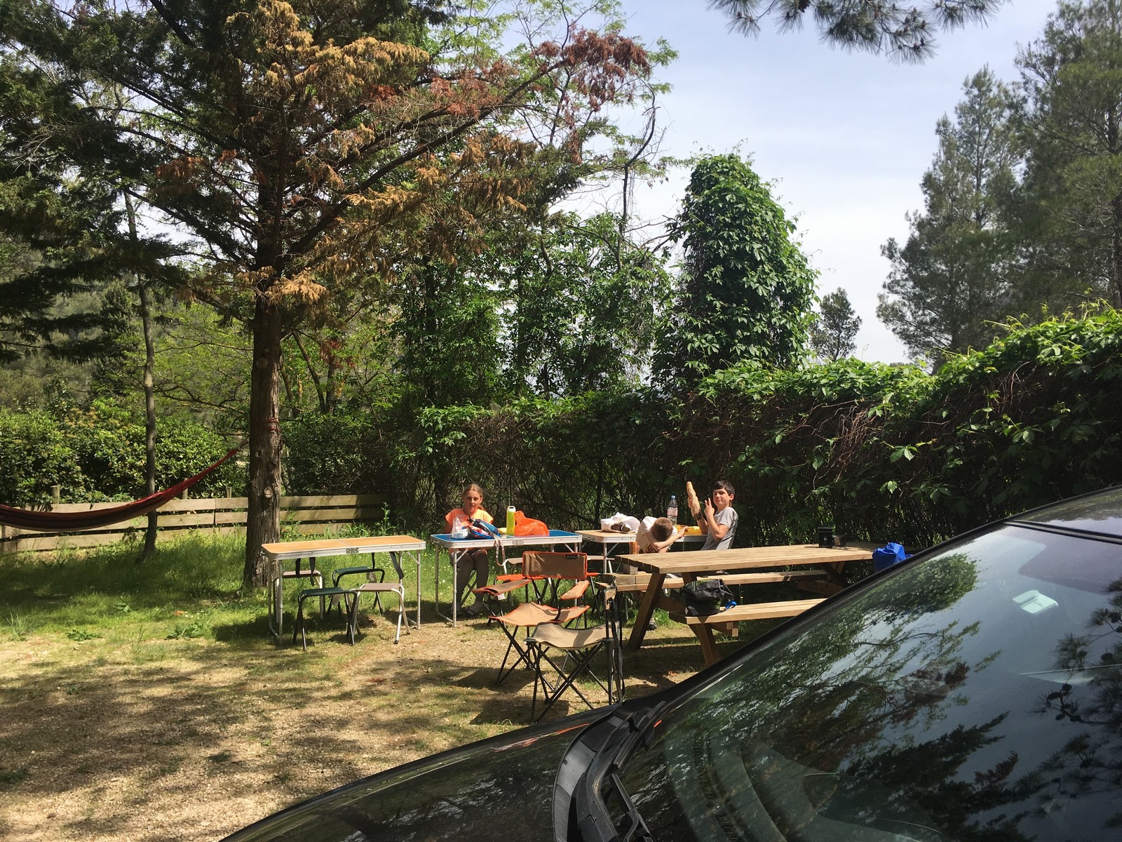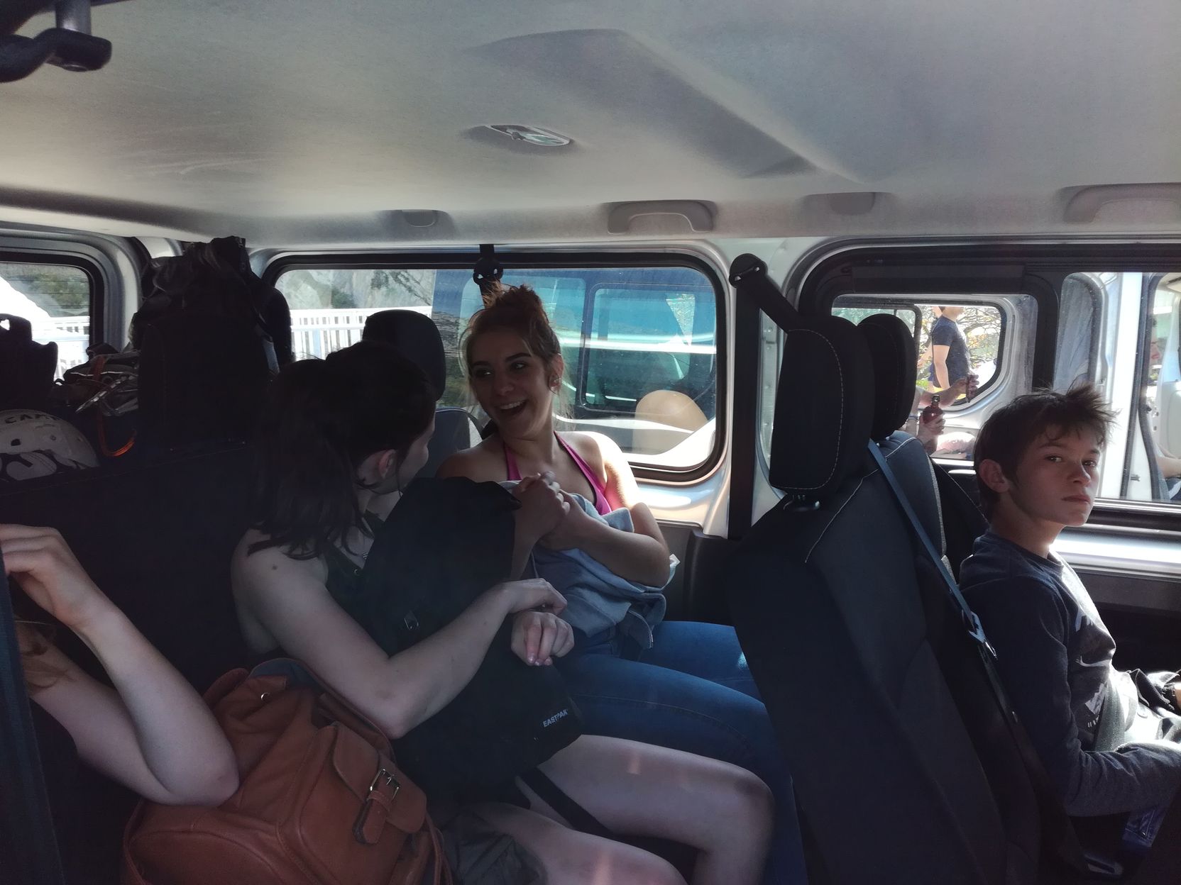 Tout le monde était donc sur la ligne de départ lundi matin frais et dispo, à l’heure du rendez-vous (entre 8h30 et 9h, soyons précis), sauf Sylvain qui est parti chercher le minibus de location. Les enfants se répartissent dans les minibus, les plus chanceux (sauf pour la musique) avec Sylvain, les autres avec Guillaume pour l’option chemins de traverse et arrêts vomis. Les adultes suivent en voiture : Delphine pour l’arrêt au drive pour récupérer les courses soigneusement commandées la veille avec Sylvain, Cécile dans la Sylvain-mobile chargée du matériel (c’est fou ce qu’on peut faire rentrer dans un kangoo !), et le papa d’Adrien qui vient donner un coup de main à l’installation du camp.