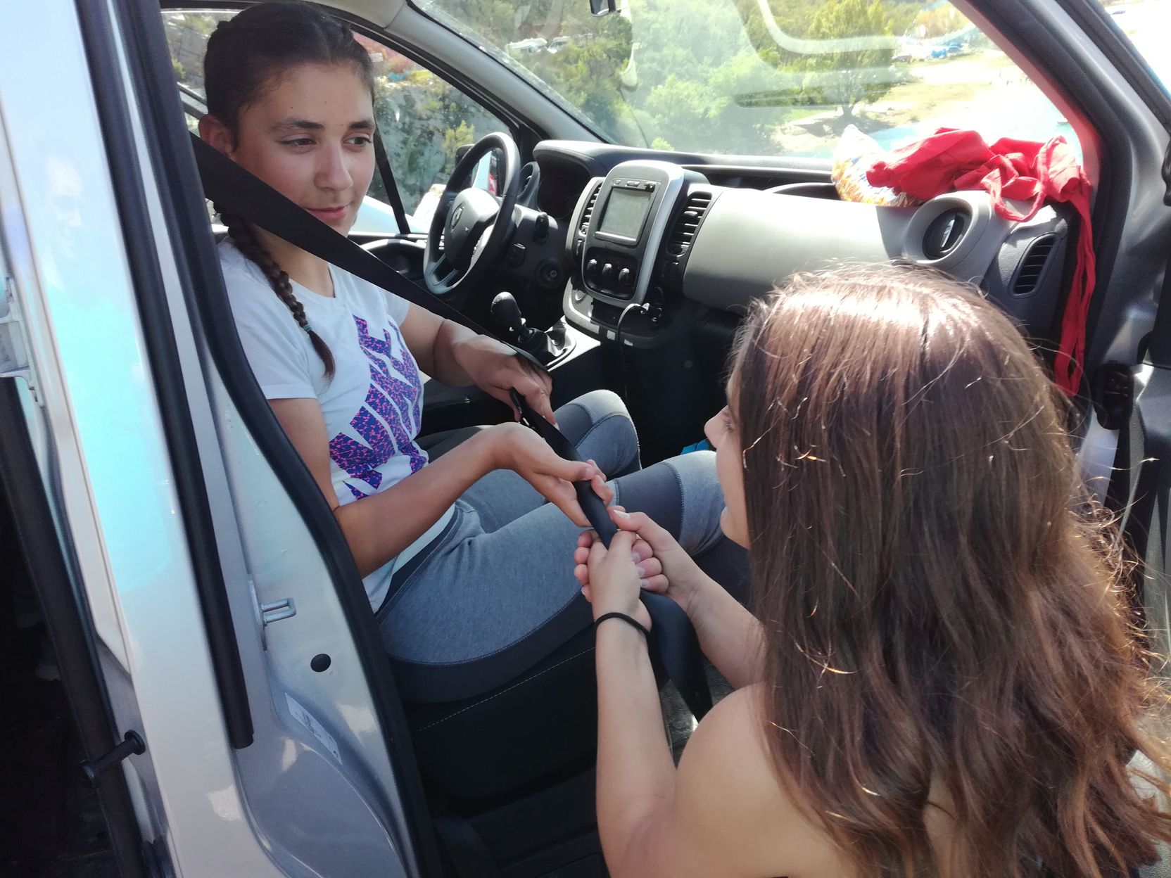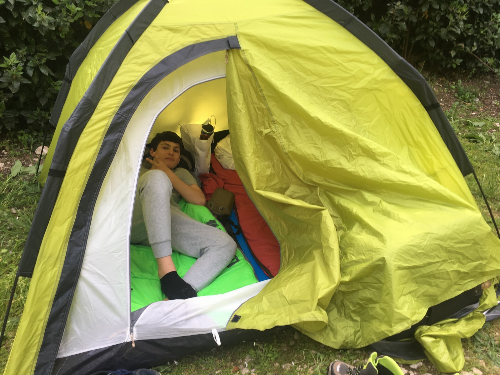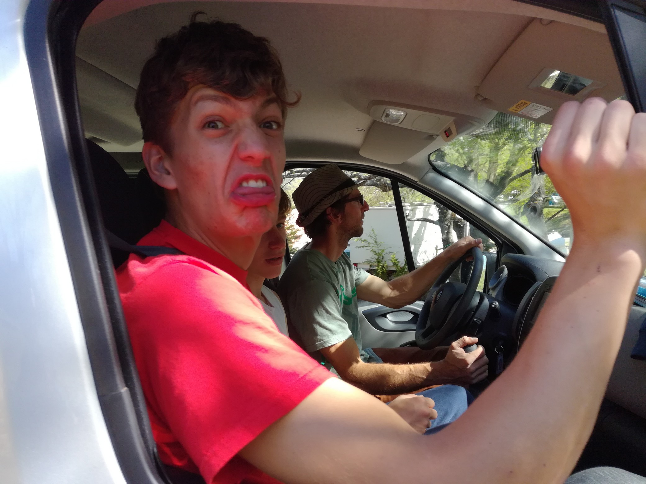 Tout le monde était donc sur la ligne de départ lundi matin frais et dispo, à l’heure du rendez-vous (entre 8h30 et 9h, soyons précis), sauf Sylvain qui est parti chercher le minibus de location. Les enfants se répartissent dans les minibus, les plus chanceux (sauf pour la musique) avec Sylvain, les autres avec Guillaume pour l’option chemins de traverse et arrêts vomis. Les adultes suivent en voiture : Delphine pour l’arrêt au drive pour récupérer les courses soigneusement commandées la veille avec Sylvain, Cécile dans la Sylvain-mobile chargée du matériel (c’est fou ce qu’on peut faire rentrer dans un kangoo !), et le papa d’Adrien qui vient donner un coup de main à l’installation du camp.