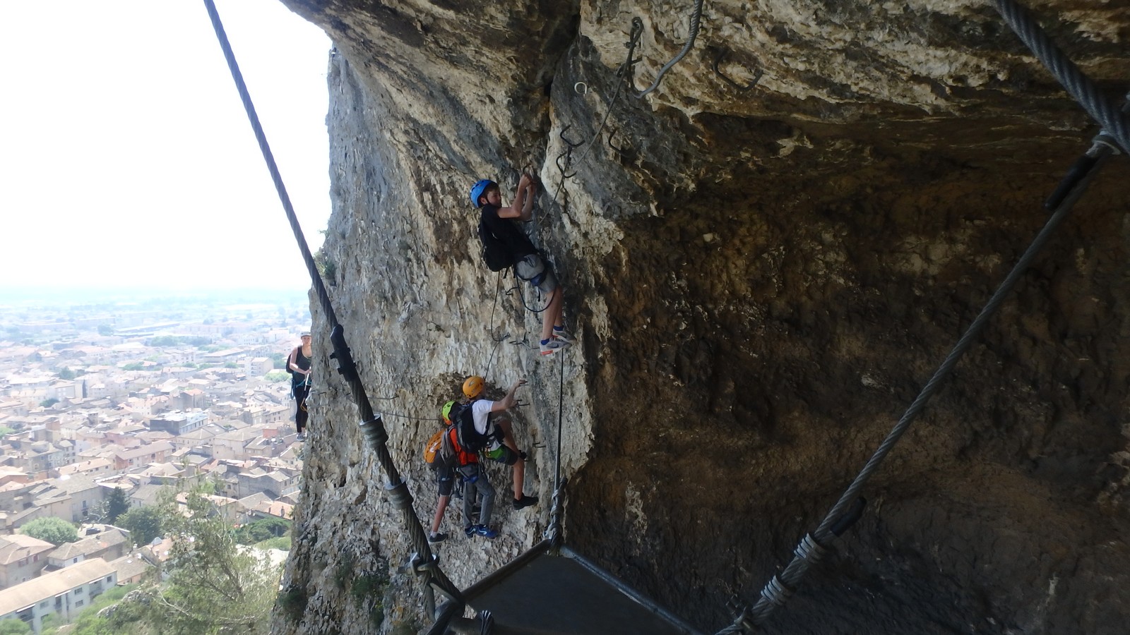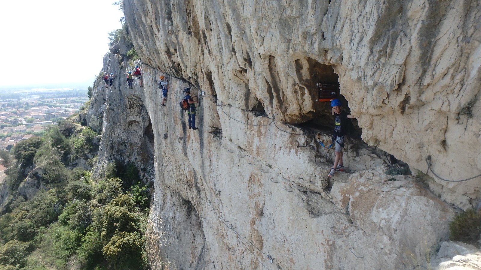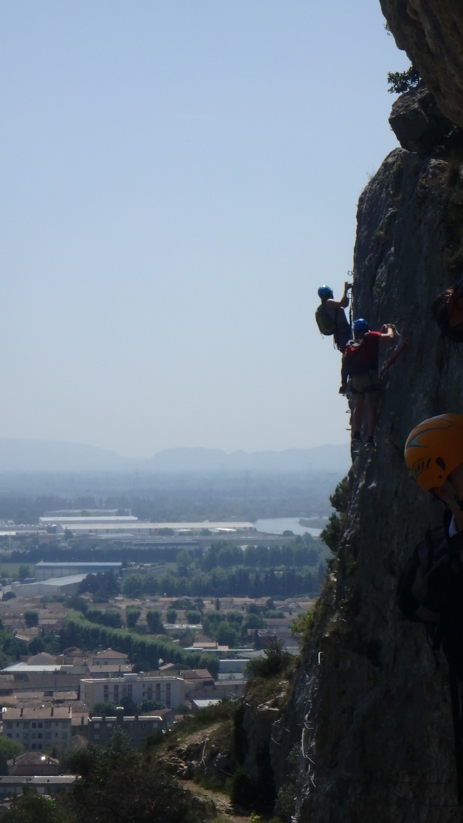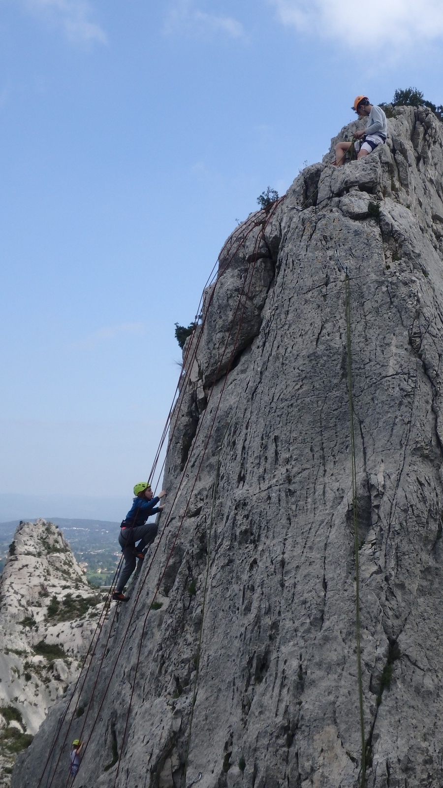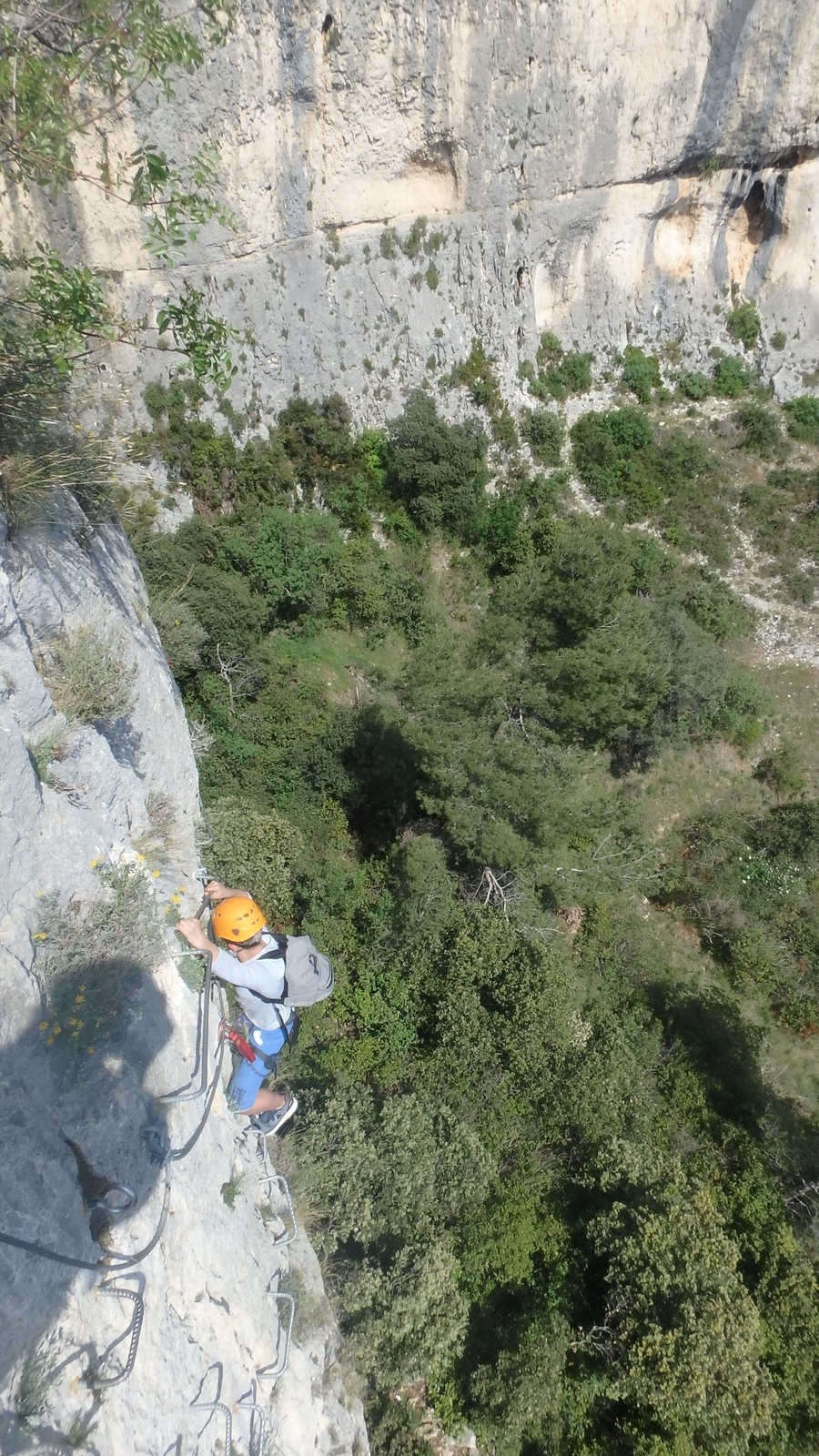 Le retour se fera au choix par l’échelle de spéléo accrochée au-dessus du vide ou par quelques longueurs fonctions de son niveau. Sylvain monte une équipe avec Guerlain, Romain, son papa et Delphine. Doucement mais sûrement, nous atteignons la route après deux longueurs dans du 5a. Superbes sensations encore… Avec les sacs sur le dos, en fin de journée, les longueurs nous ont paru bien dures !