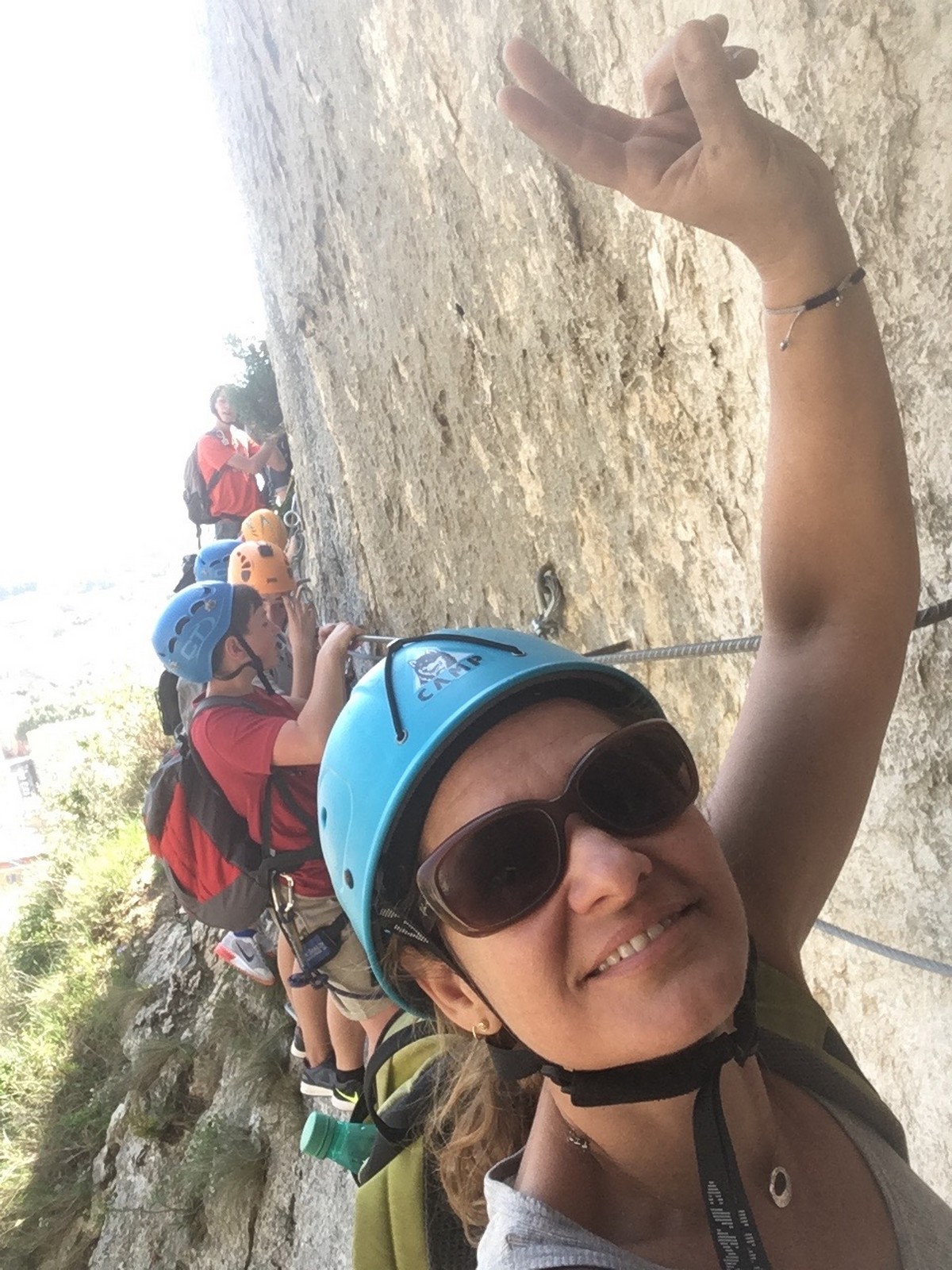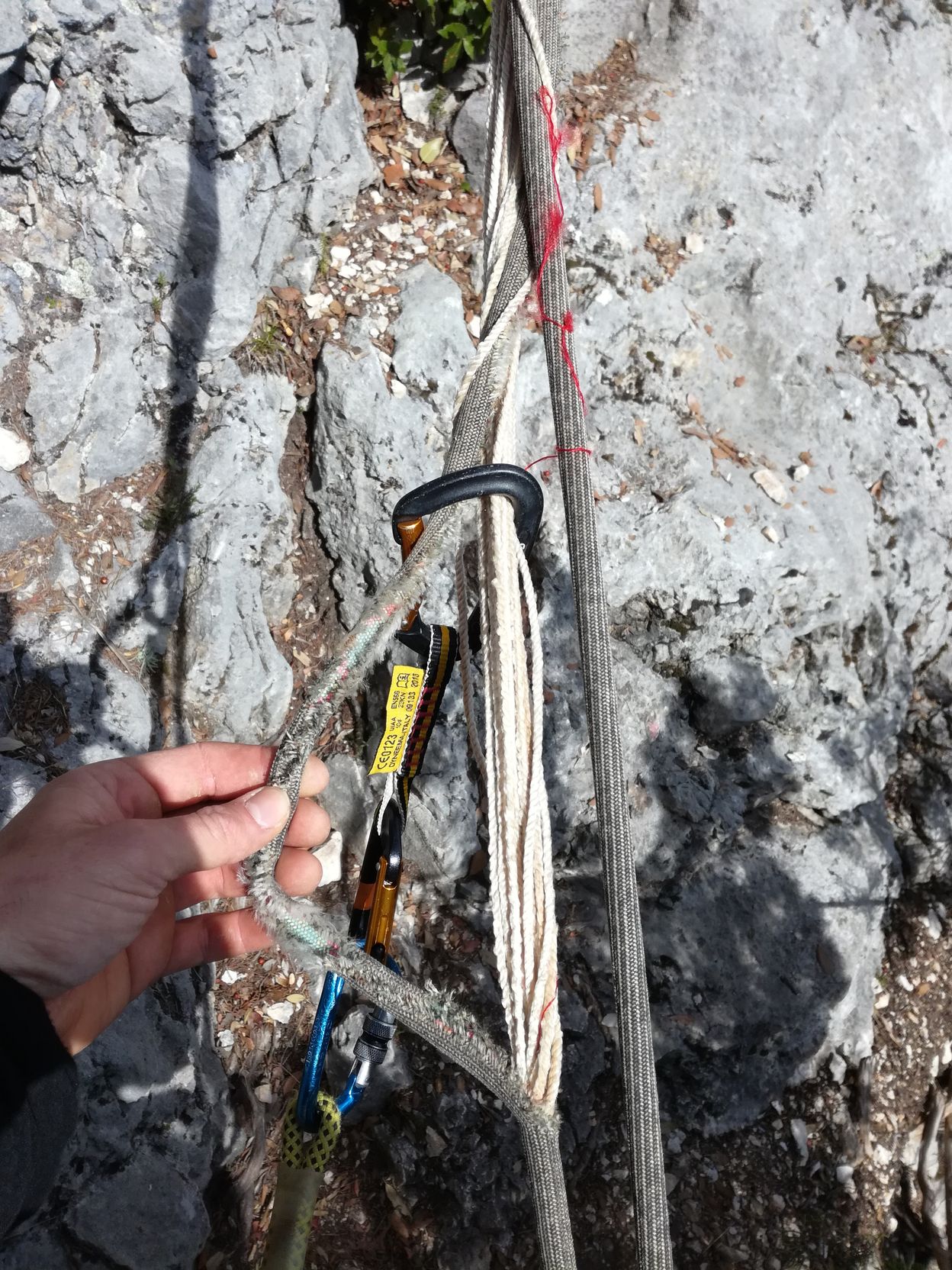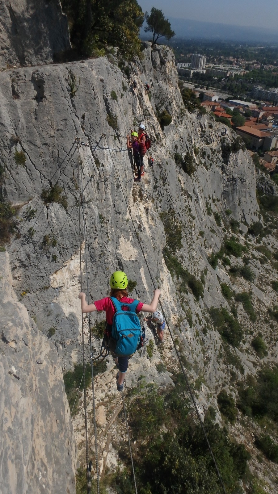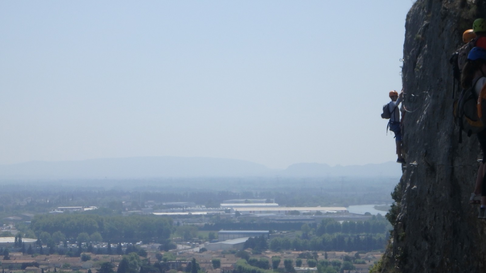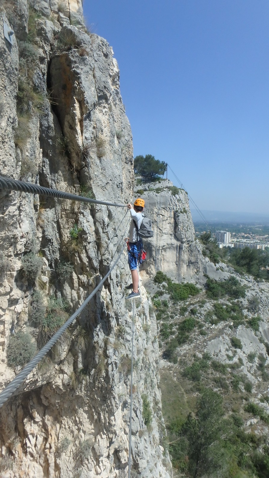 Le retour se fera au choix par l’échelle de spéléo accrochée au-dessus du vide ou par quelques longueurs fonctions de son niveau. Sylvain monte une équipe avec Guerlain, Romain, son papa et Delphine. Doucement mais sûrement, nous atteignons la route après deux longueurs dans du 5a. Superbes sensations encore… Avec les sacs sur le dos, en fin de journée, les longueurs nous ont paru bien dures !