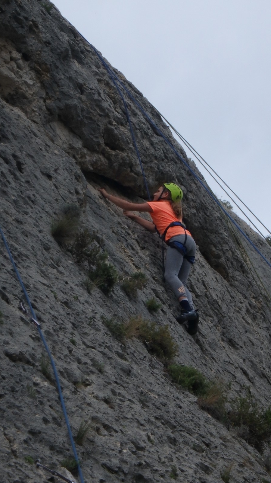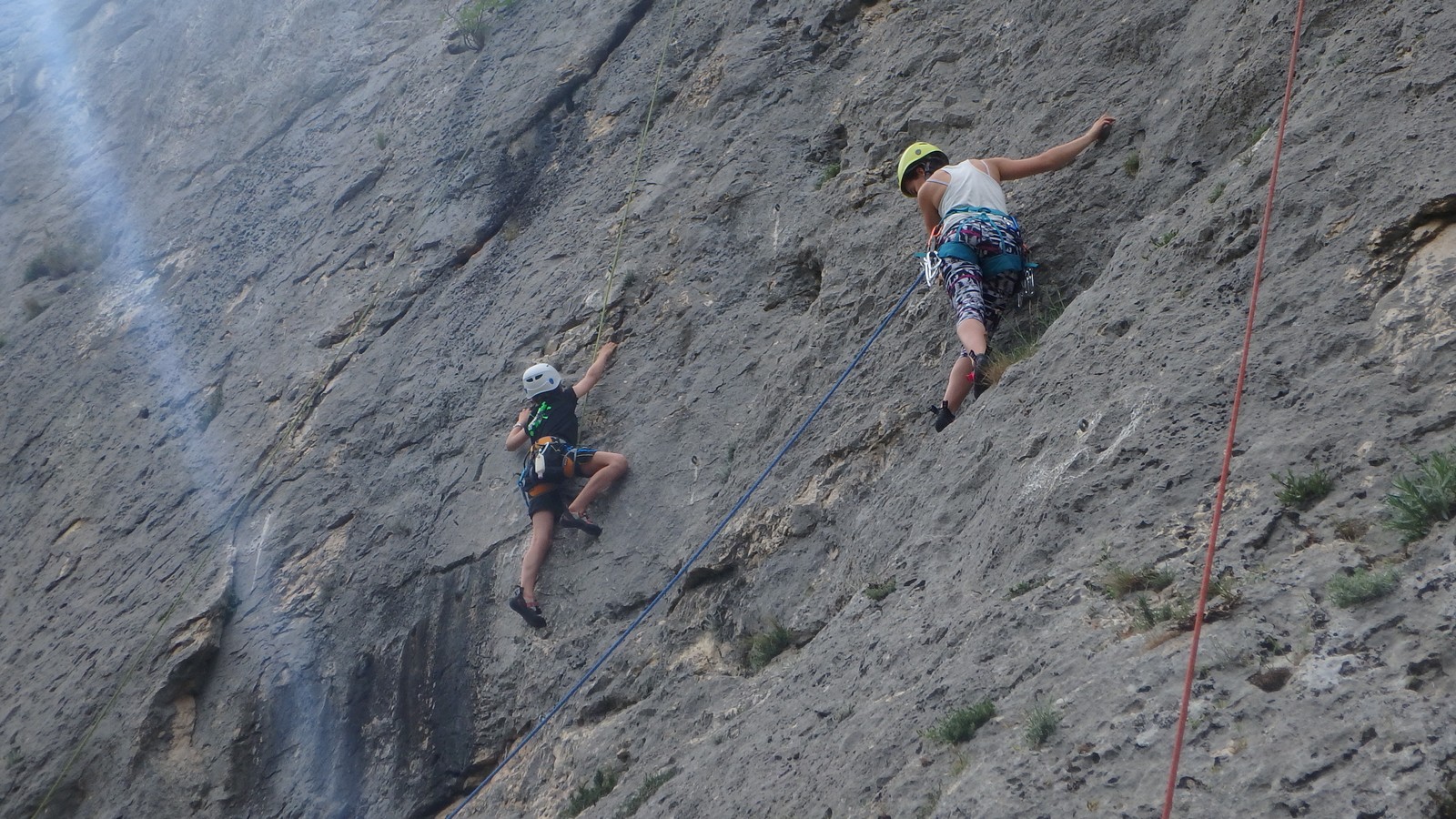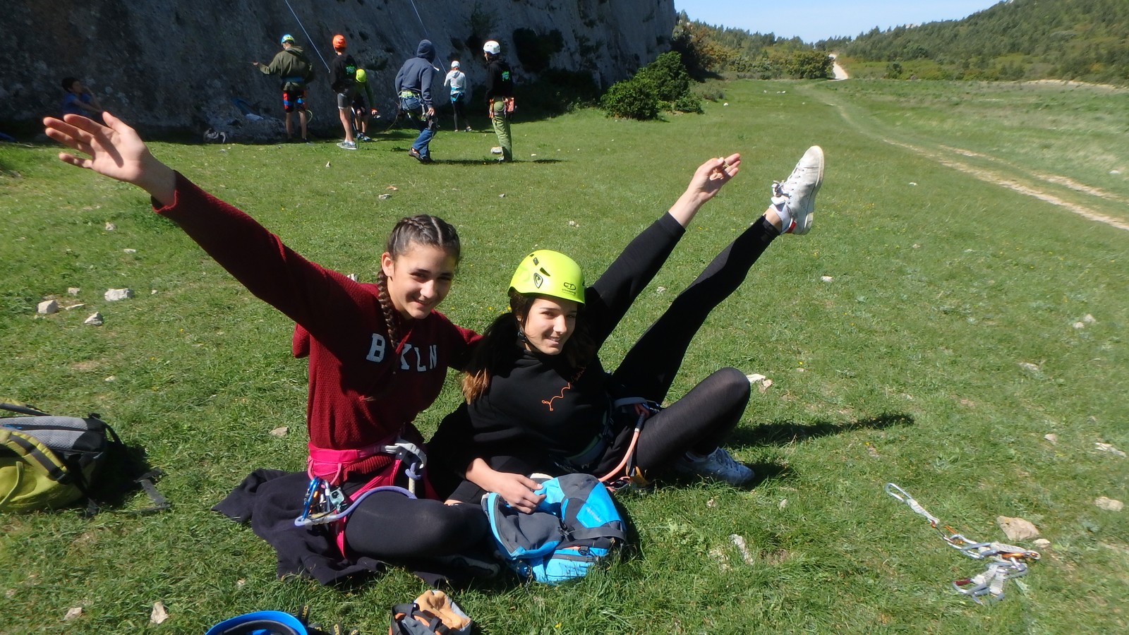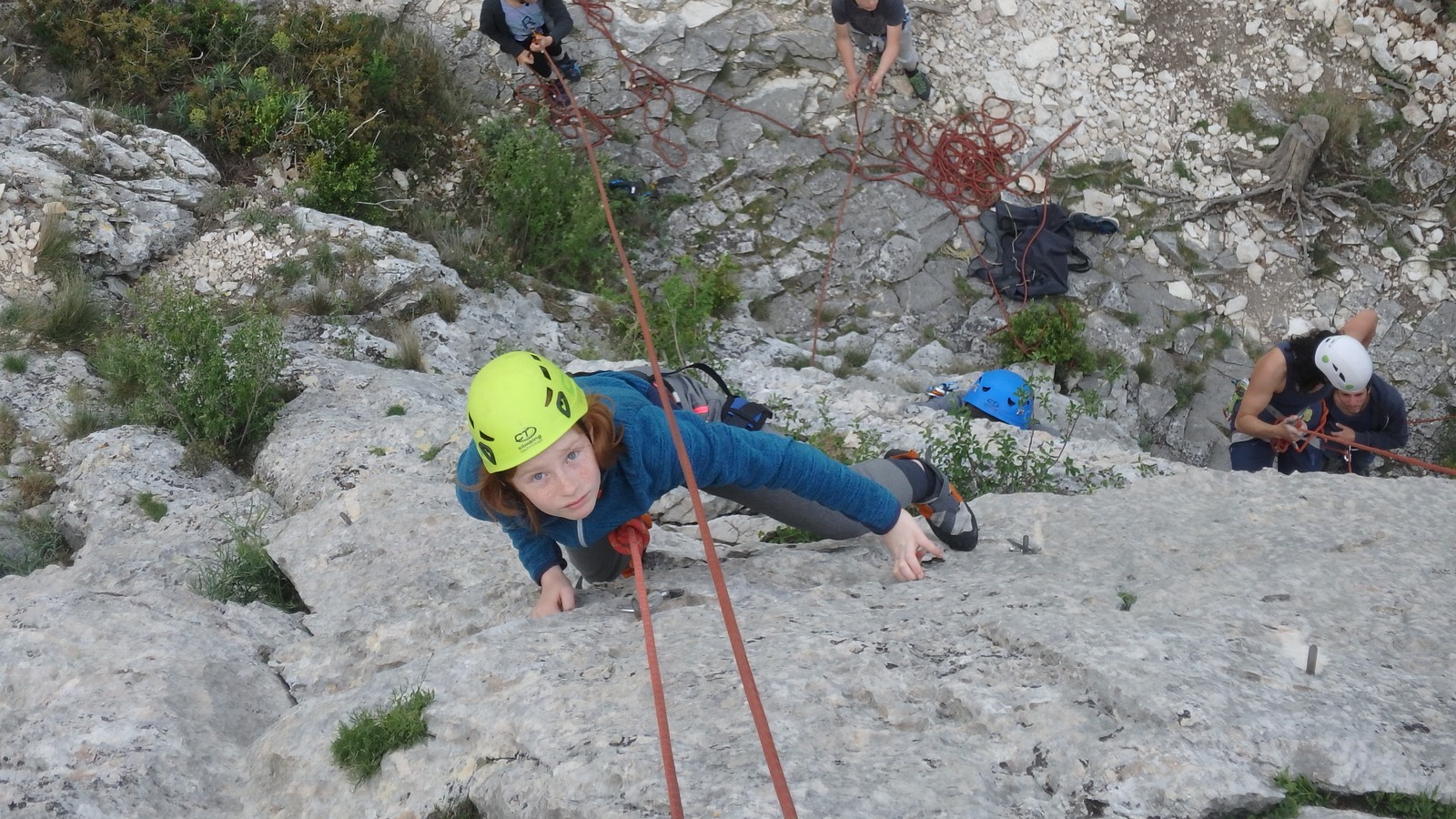 Les jeunes se lancent à l’assaut des voies, toujours chacun à son rythme. Lisa et Océane, que Sylvain et Guillaume poussent un peu plus que les autres, ont pour objectif 8 voies dans la journée. Océane peine à se délester d’une peur du vol tenace qui la prend dans un joli 6a un poil engagé que Lisa enchainera juste derrière. Les filles en seront bonnes pour une école de vol !