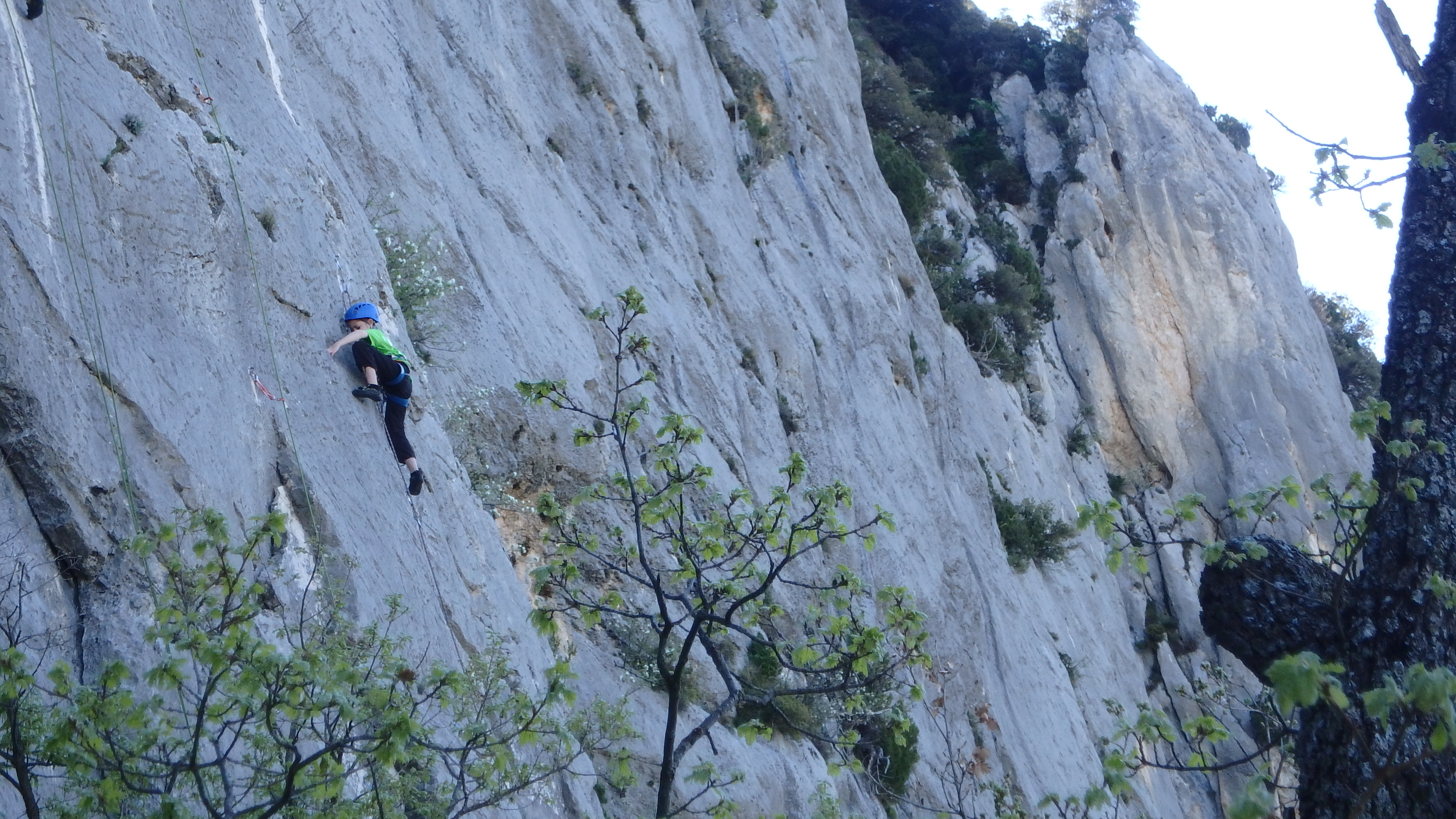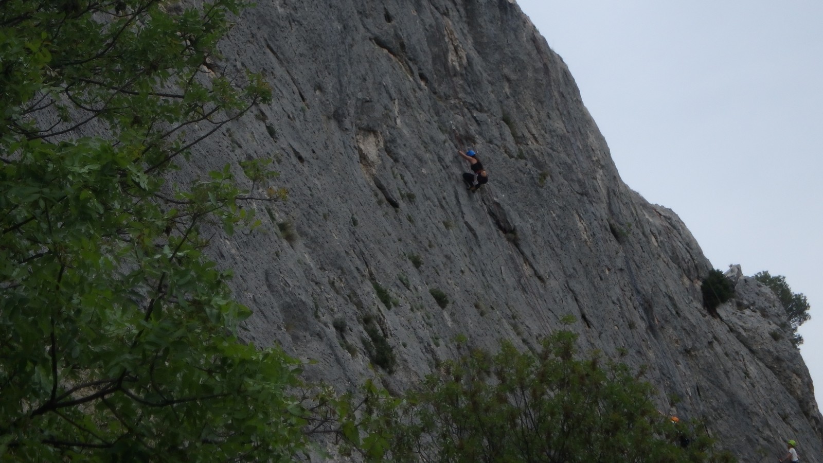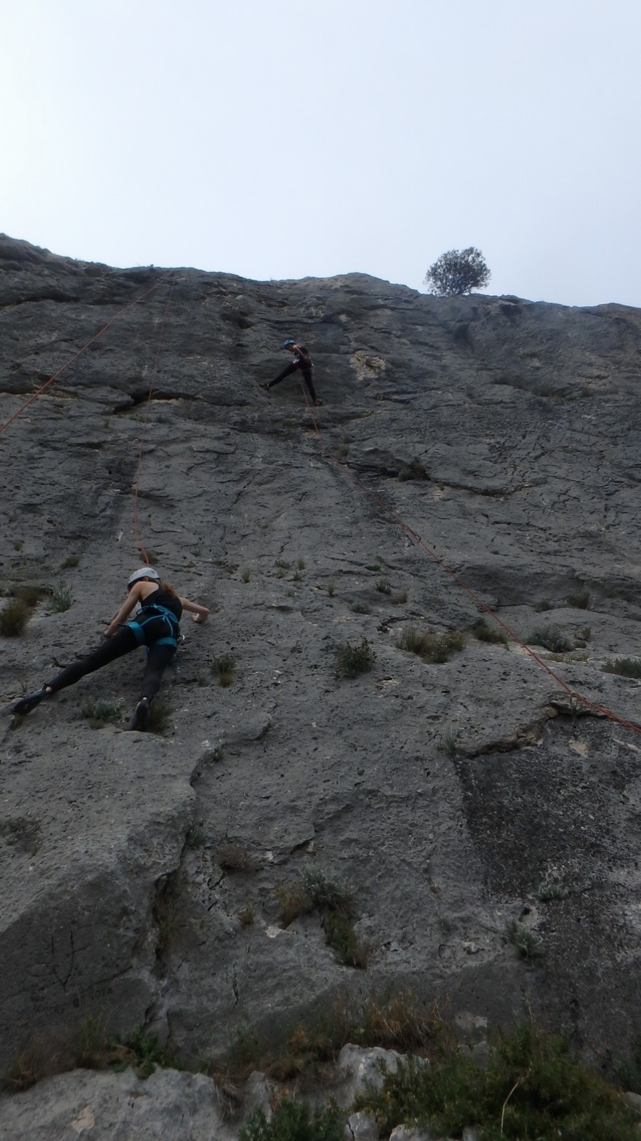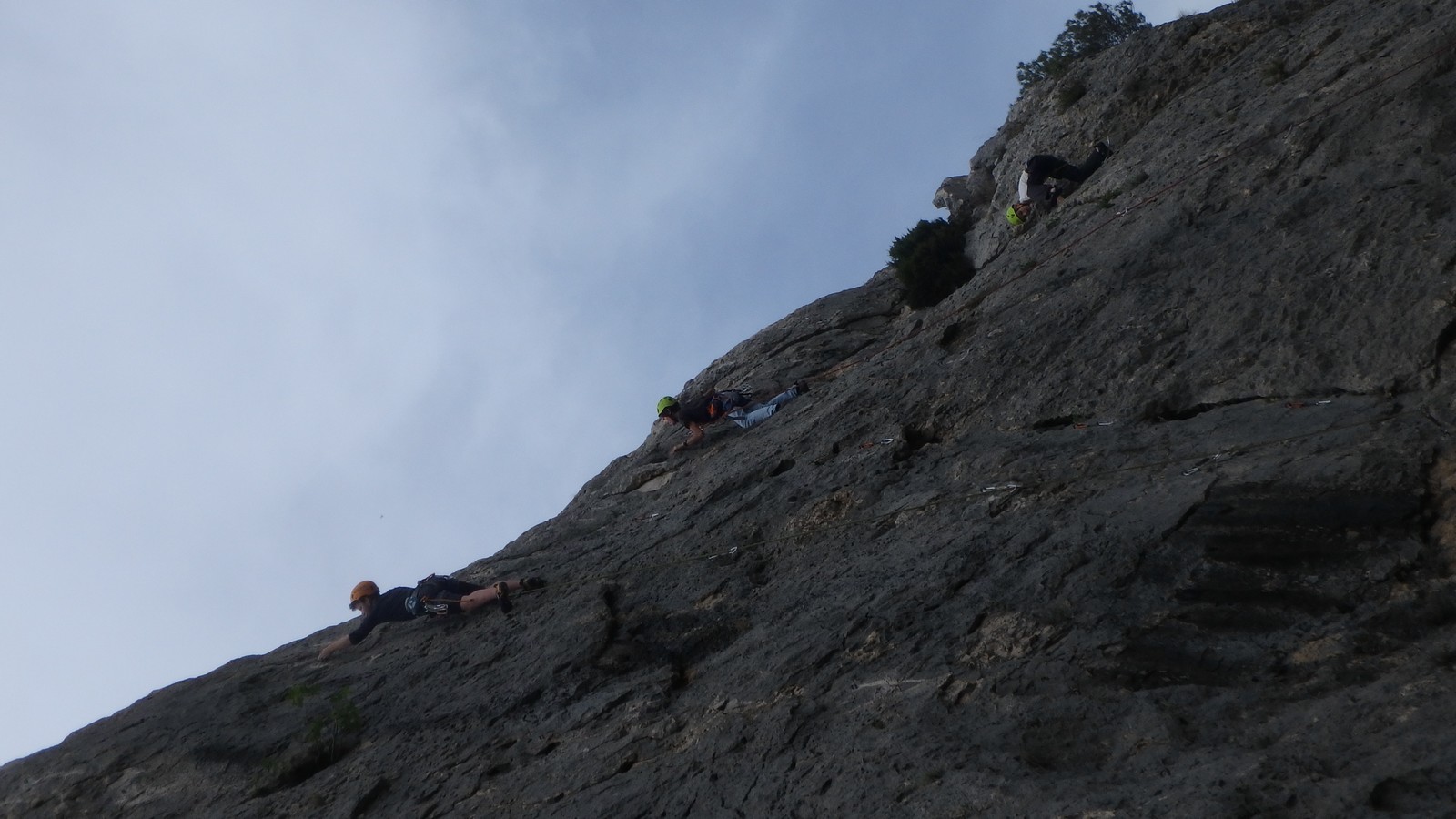Les jeunes se lancent à l’assaut des voies, toujours chacun à son rythme. Lisa et Océane, que Sylvain et Guillaume poussent un peu plus que les autres, ont pour objectif 8 voies dans la journée. Océane peine à se délester d’une peur du vol tenace qui la prend dans un joli 6a un poil engagé que Lisa enchainera juste derrière. Les filles en seront bonnes pour une école de vol !