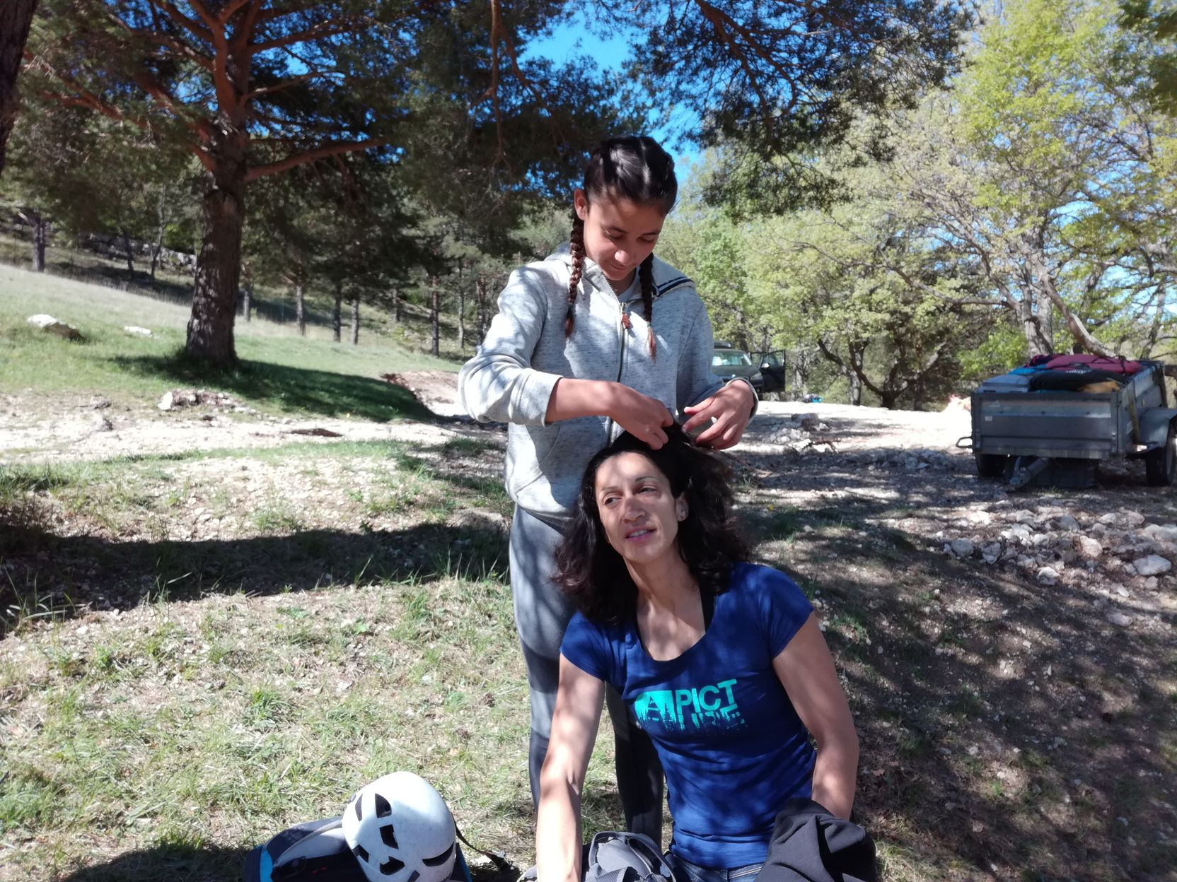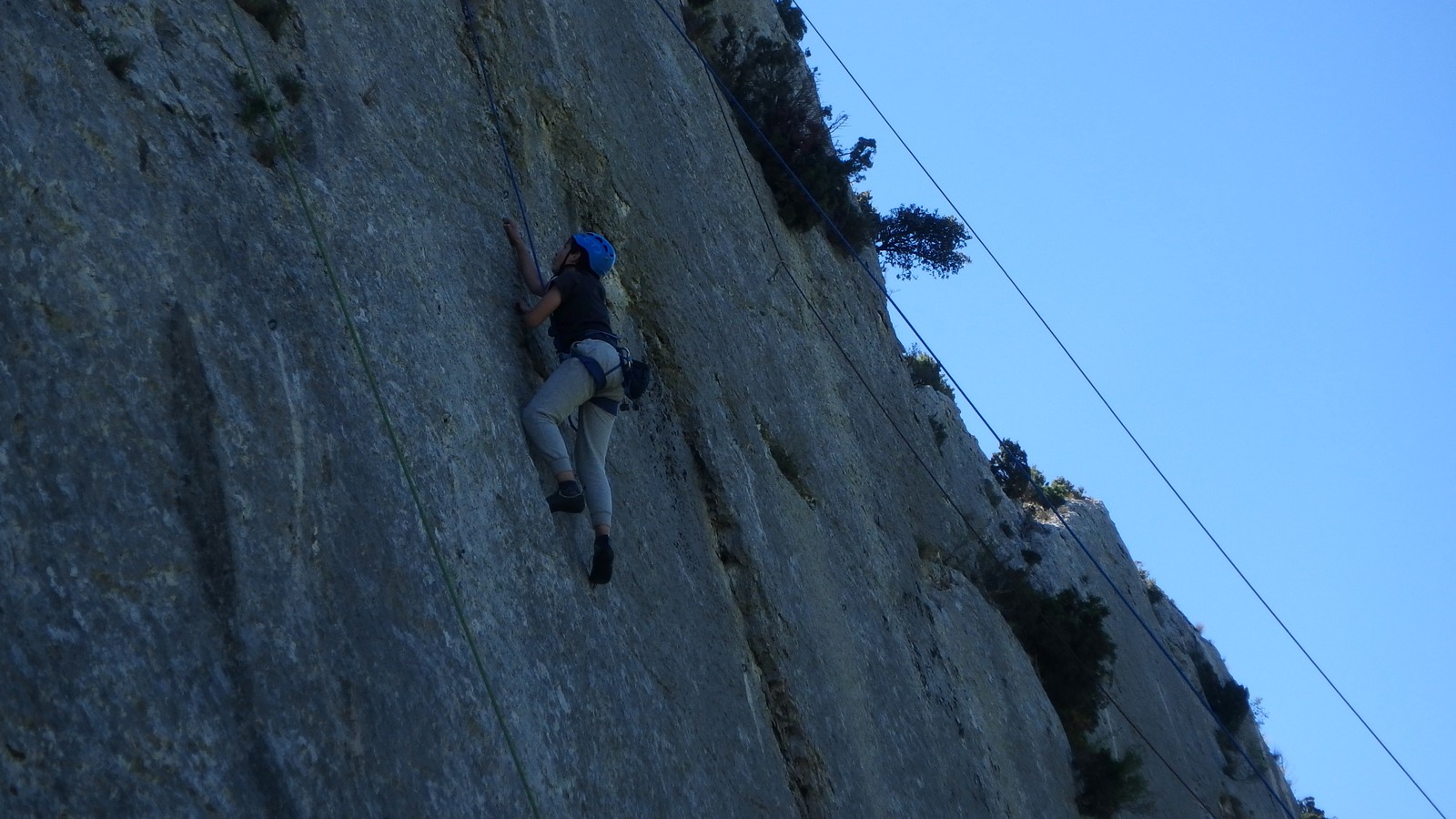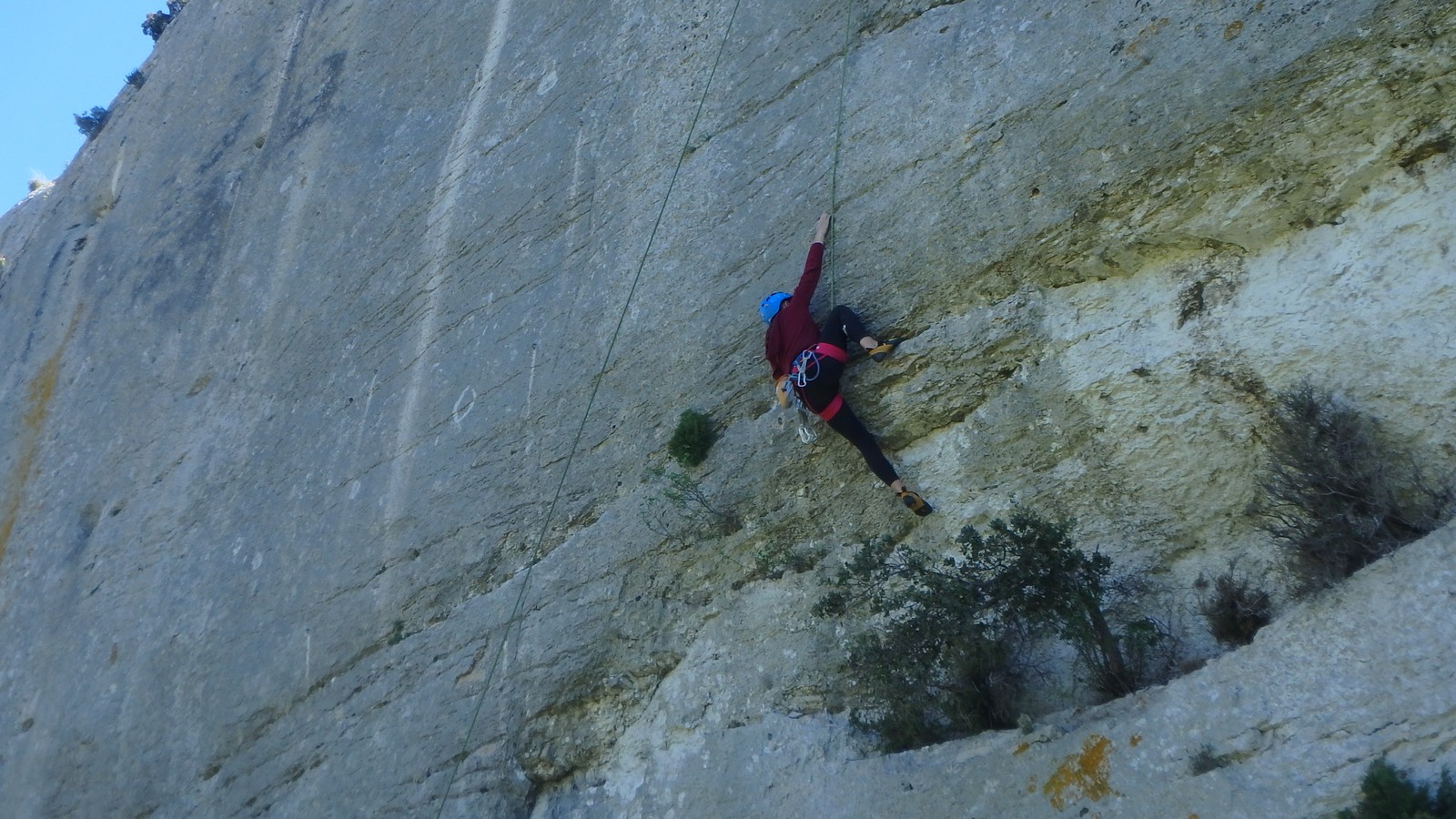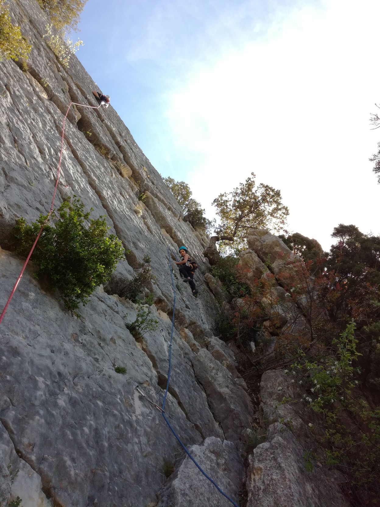 Les jeunes se lancent à l’assaut des voies, toujours chacun à son rythme. Lisa et Océane, que Sylvain et Guillaume poussent un peu plus que les autres, ont pour objectif 8 voies dans la journée. Océane peine à se délester d’une peur du vol tenace qui la prend dans un joli 6a un poil engagé que Lisa enchainera juste derrière. Les filles en seront bonnes pour une école de vol !