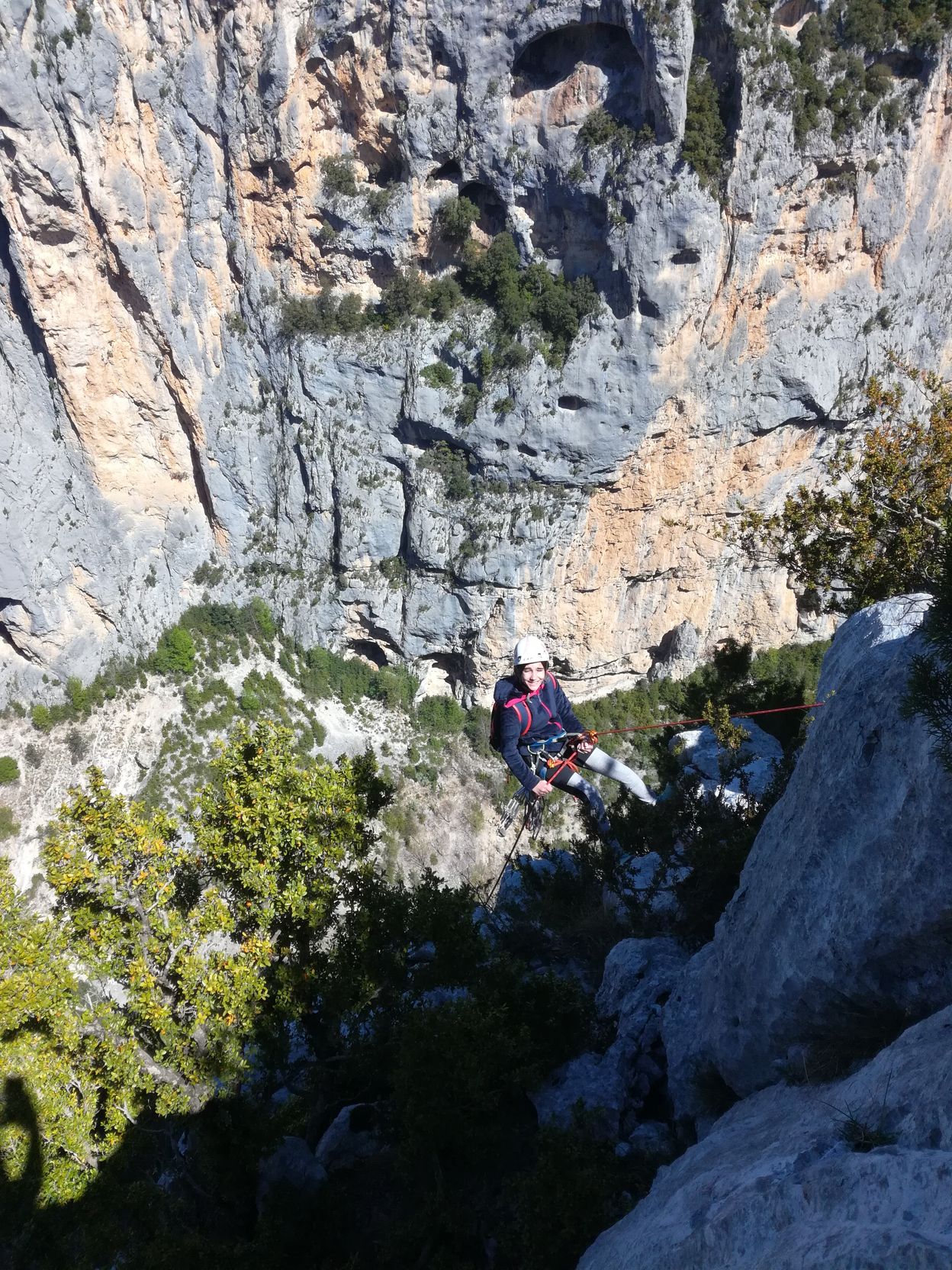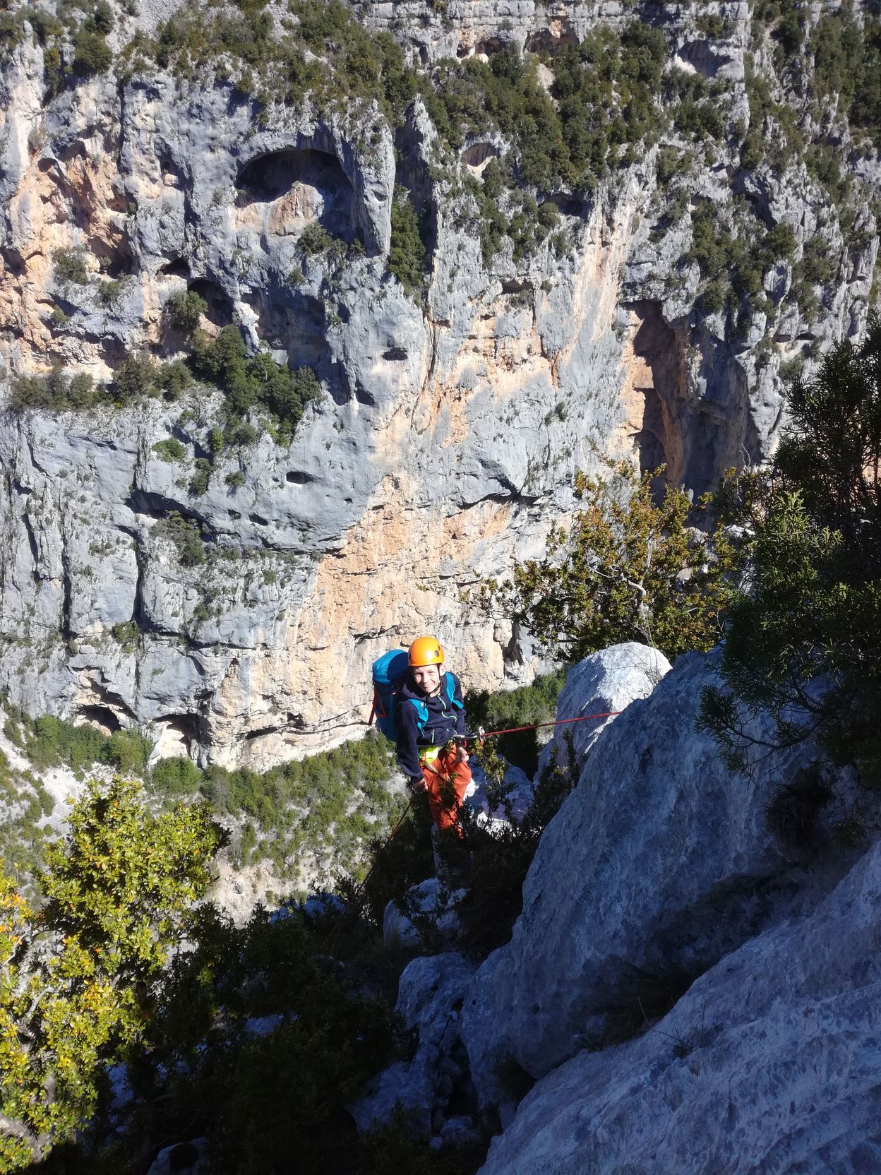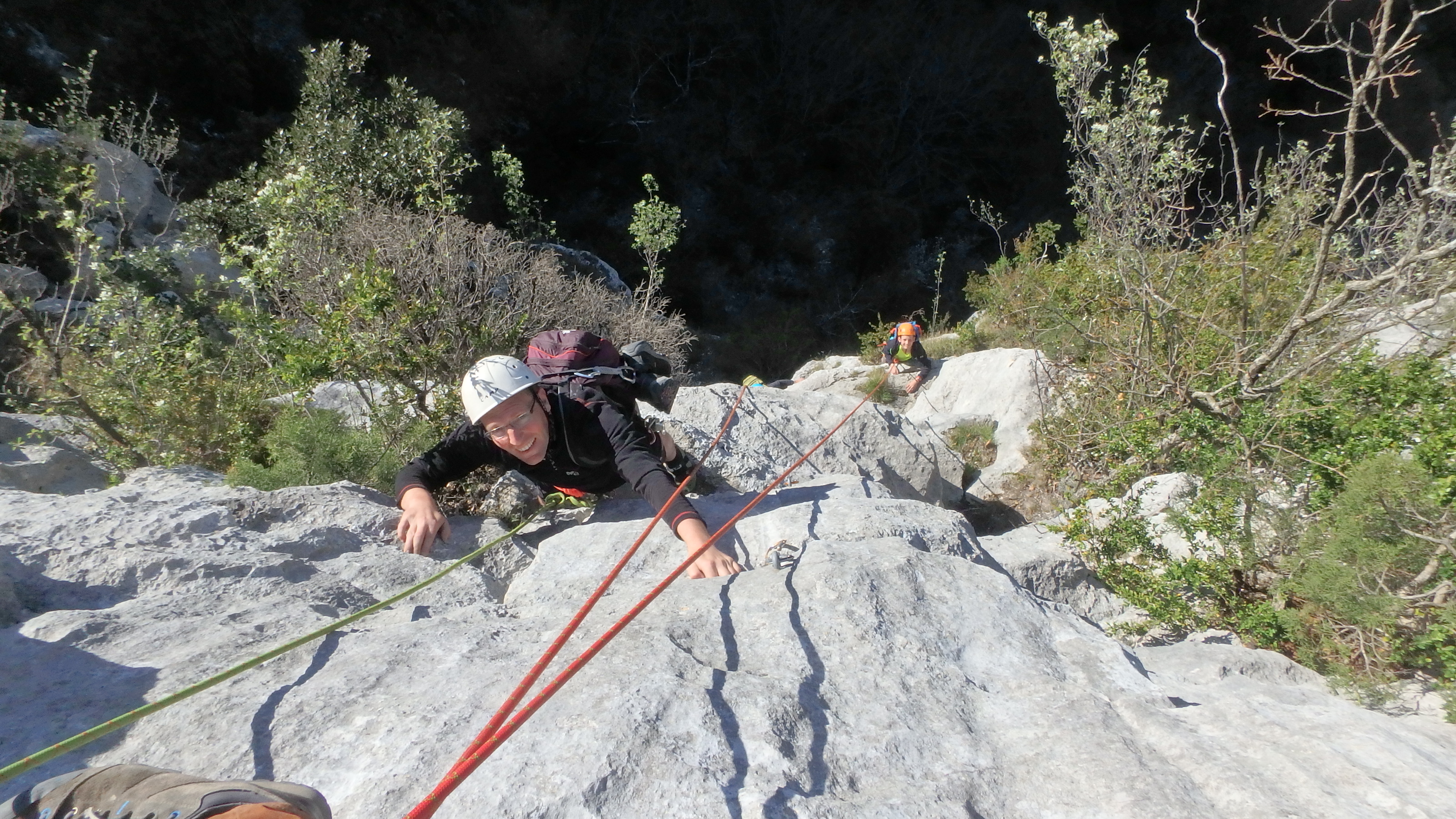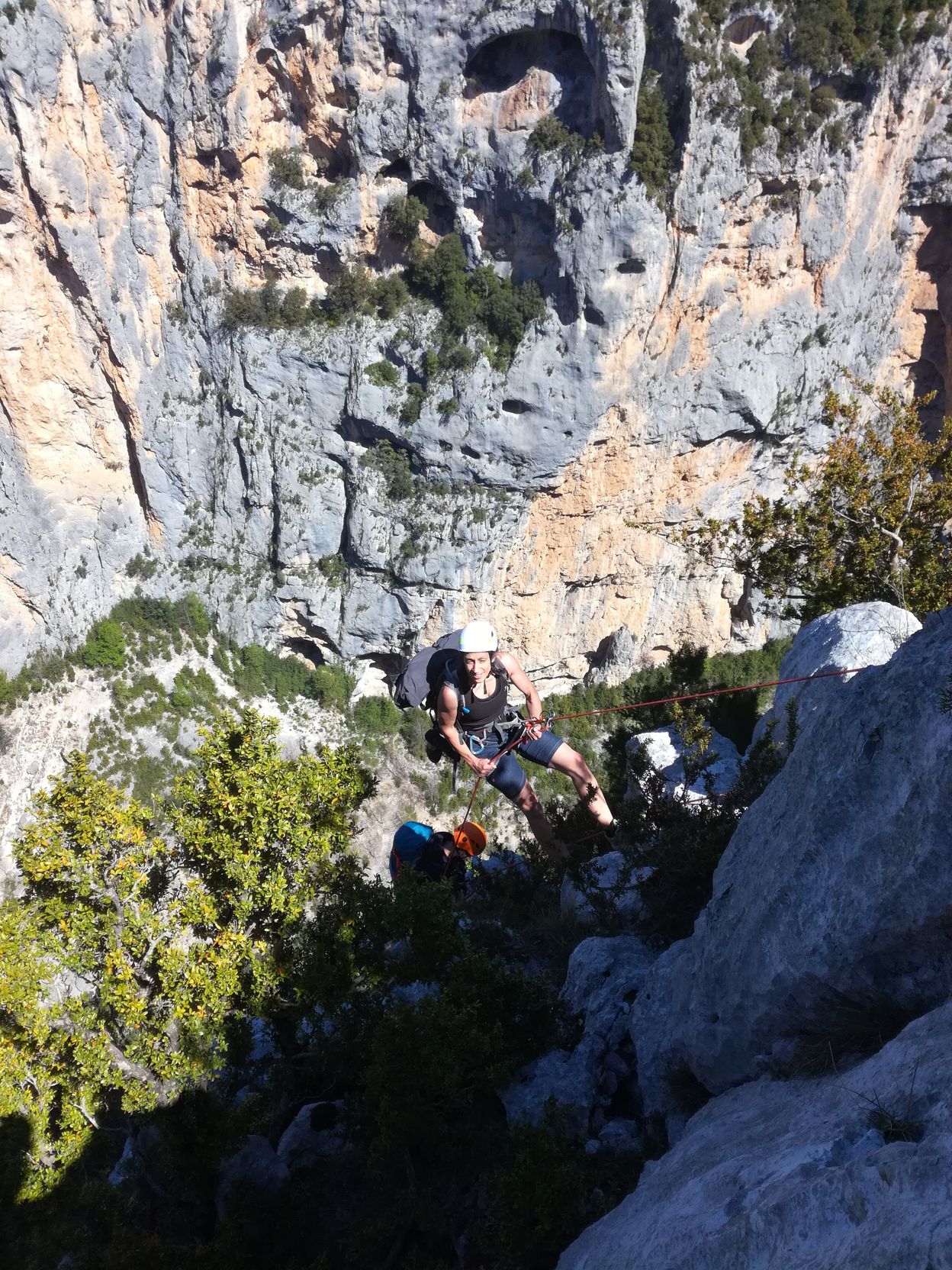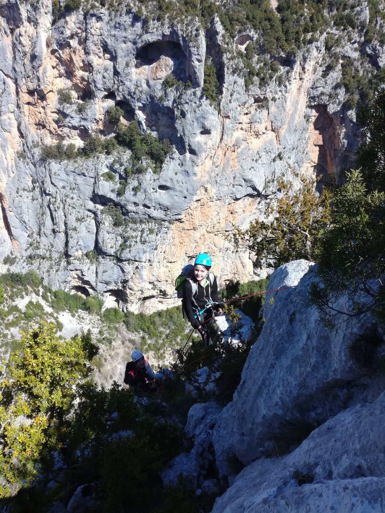Ce jour-là on bat nos records de désorientation (il faut dire à notre décharge que les topos n’étaient pas très clairs et assez contradictoires), avec allers-retours en camions, en footing et en mode sanglier dans les broussailles pour repérer le départ des rappels. C’est long mais les enfants prennent leur mal en patience en inventant une chanson dédiée au club et à leurs moniteurs : « Avec Guillaume et Sylvain, on n’est jamais sûr de rien ! » Une petite variante plus loin, « Avec Guillaume et Sylvain, on n’est jamais sur l’bon chemin !« , nous descendons à tour de rôle (rapidement, on est rôdé de la veille) dans un décor impressionnant, celui du plus grand canyon d’Europe !