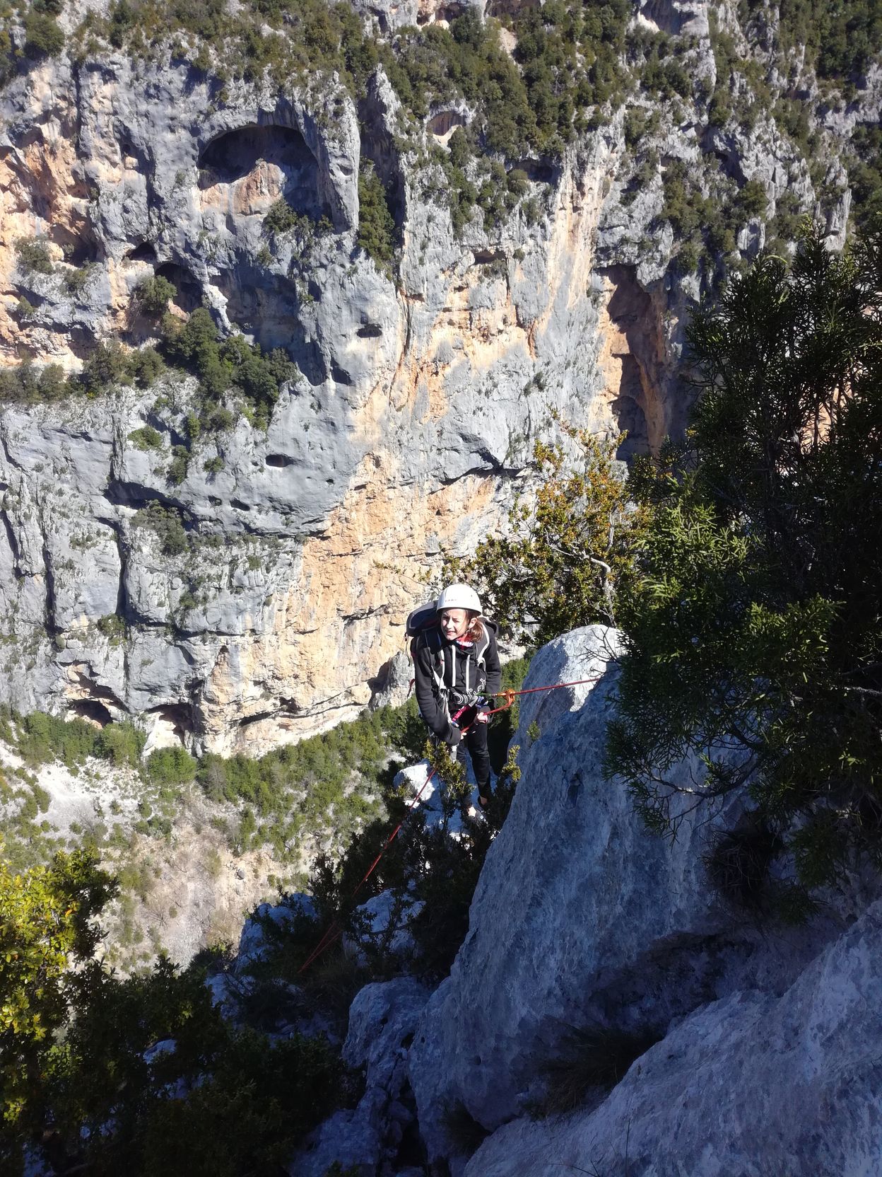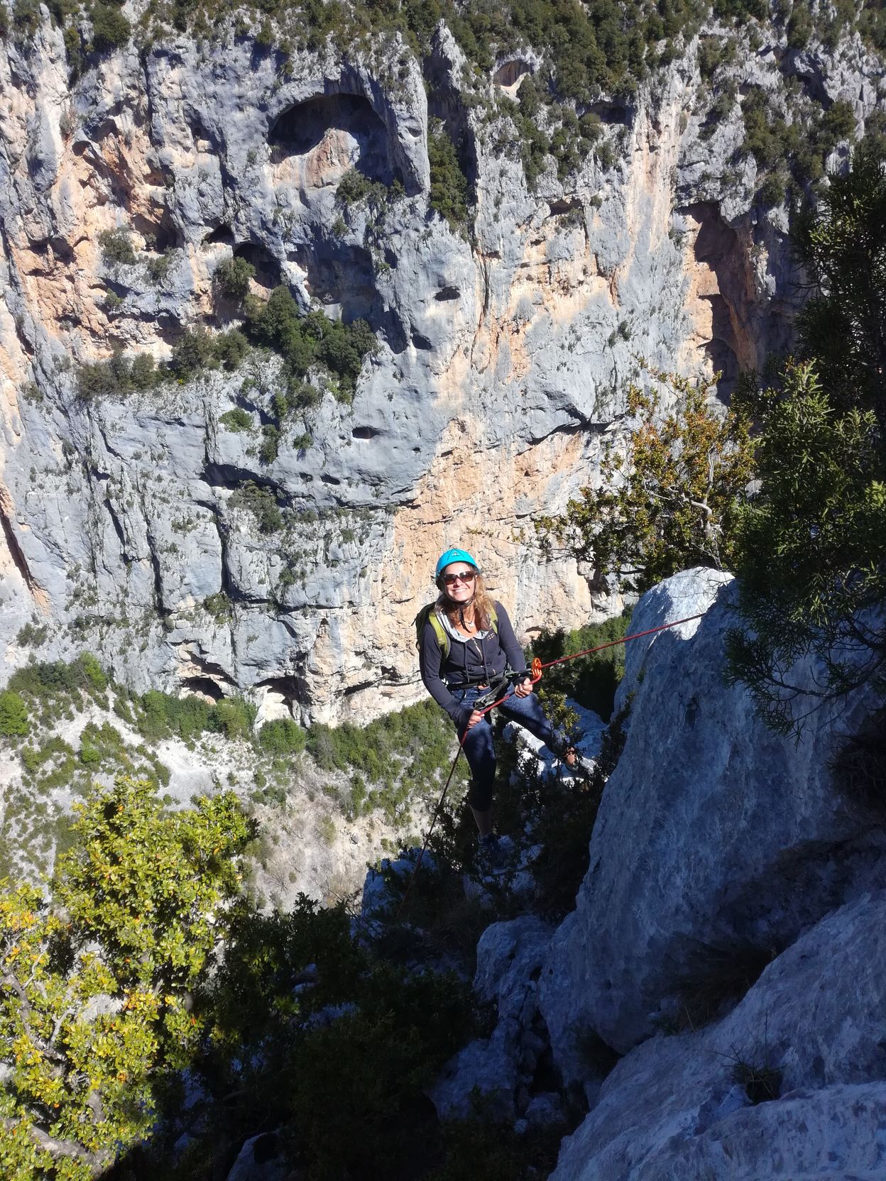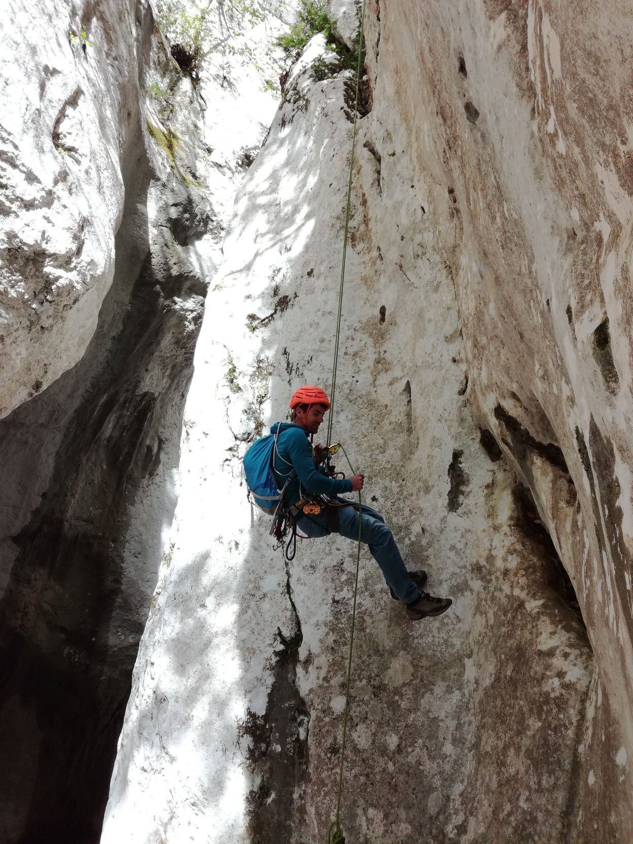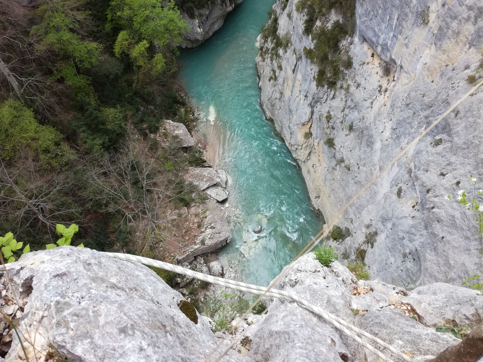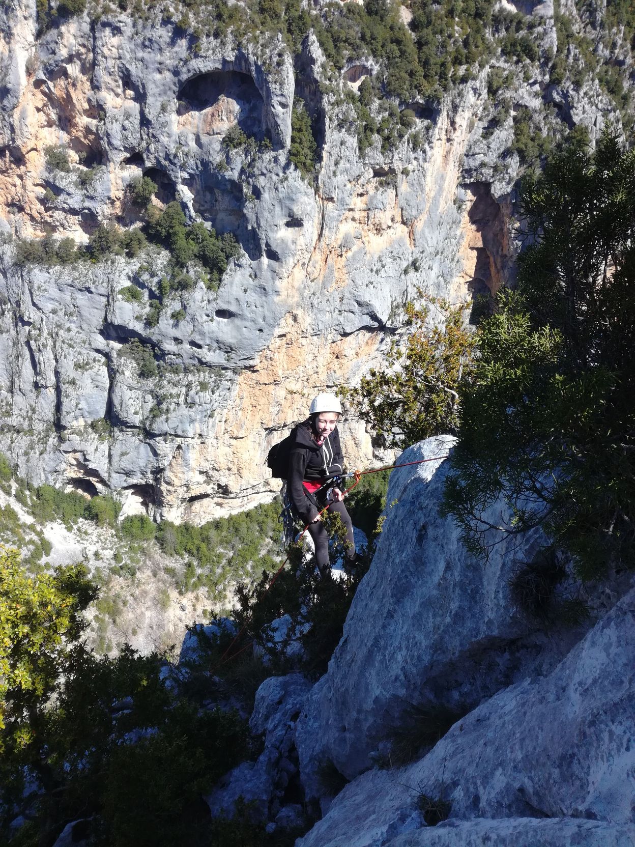Ce jour-là on bat nos records de désorientation (il faut dire à notre décharge que les topos n’étaient pas très clairs et assez contradictoires), avec allers-retours en camions, en footing et en mode sanglier dans les broussailles pour repérer le départ des rappels. C’est long mais les enfants prennent leur mal en patience en inventant une chanson dédiée au club et à leurs moniteurs : « Avec Guillaume et Sylvain, on n’est jamais sûr de rien ! » Une petite variante plus loin, « Avec Guillaume et Sylvain, on n’est jamais sur l’bon chemin !« , nous descendons à tour de rôle (rapidement, on est rôdé de la veille) dans un décor impressionnant, celui du plus grand canyon d’Europe !