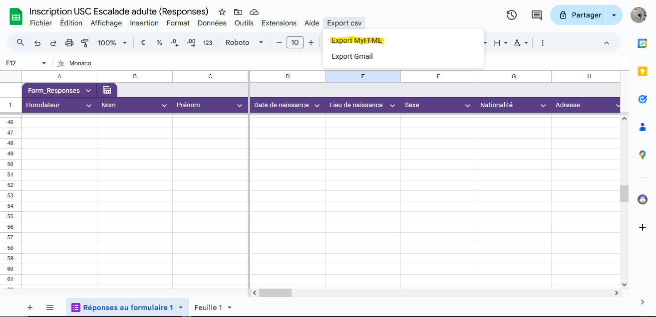 Ouvrir le fichier d’export créé dans le Drive dans le même dossier que le fichier de réponses.
