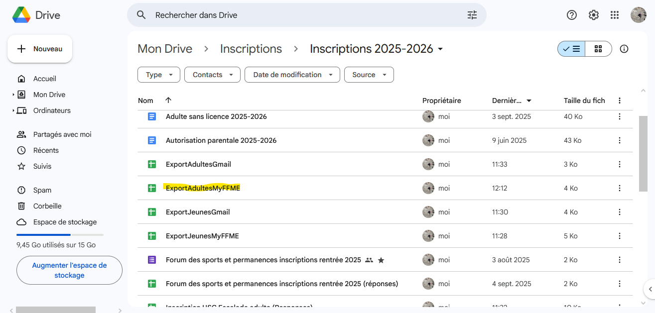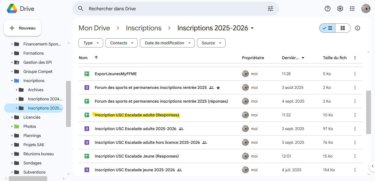 Aller dans le Drive dans le dossier des Inscriptions et ouvrir le fichier de réponses au formulaire concerné (Jeunes ou Adultes)