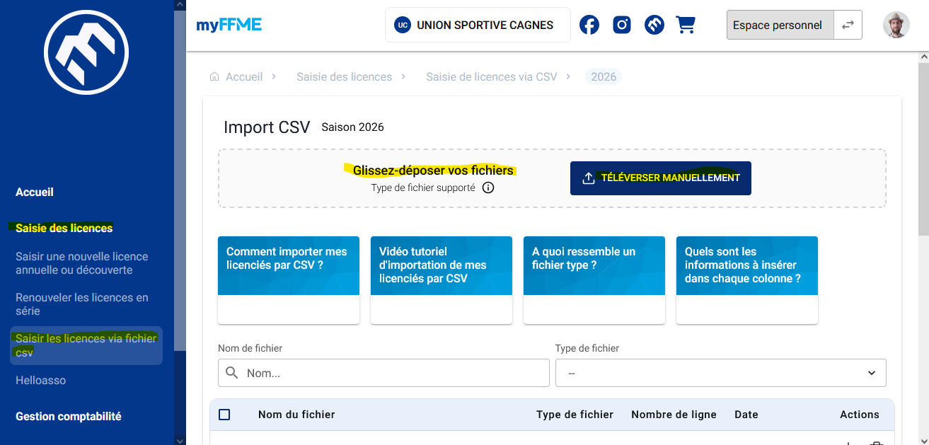 Se connecter à https://www.uscescalade.fr/site-de-rencontre-libanais-a-montreal/ (espace fédéral). Dans le menu, cliquer sur Saisie des licences -> Saisir les licences via fichier csv
