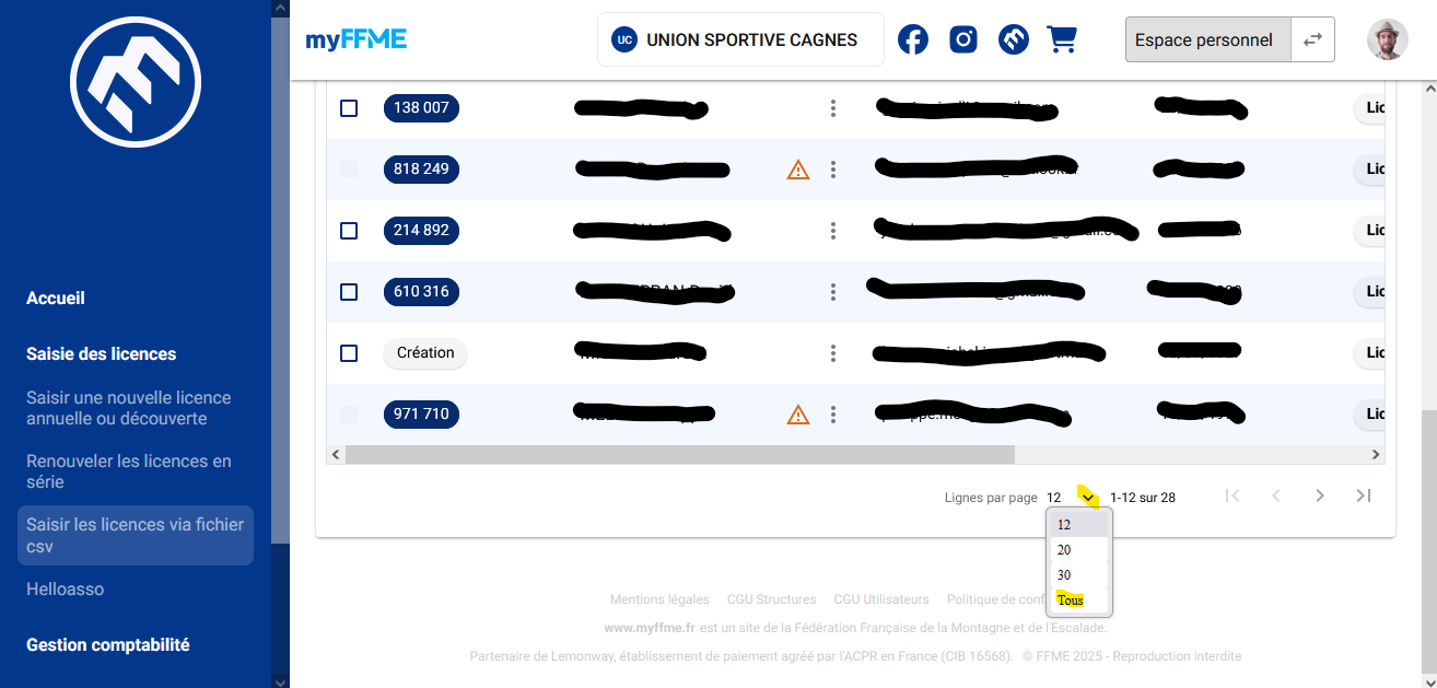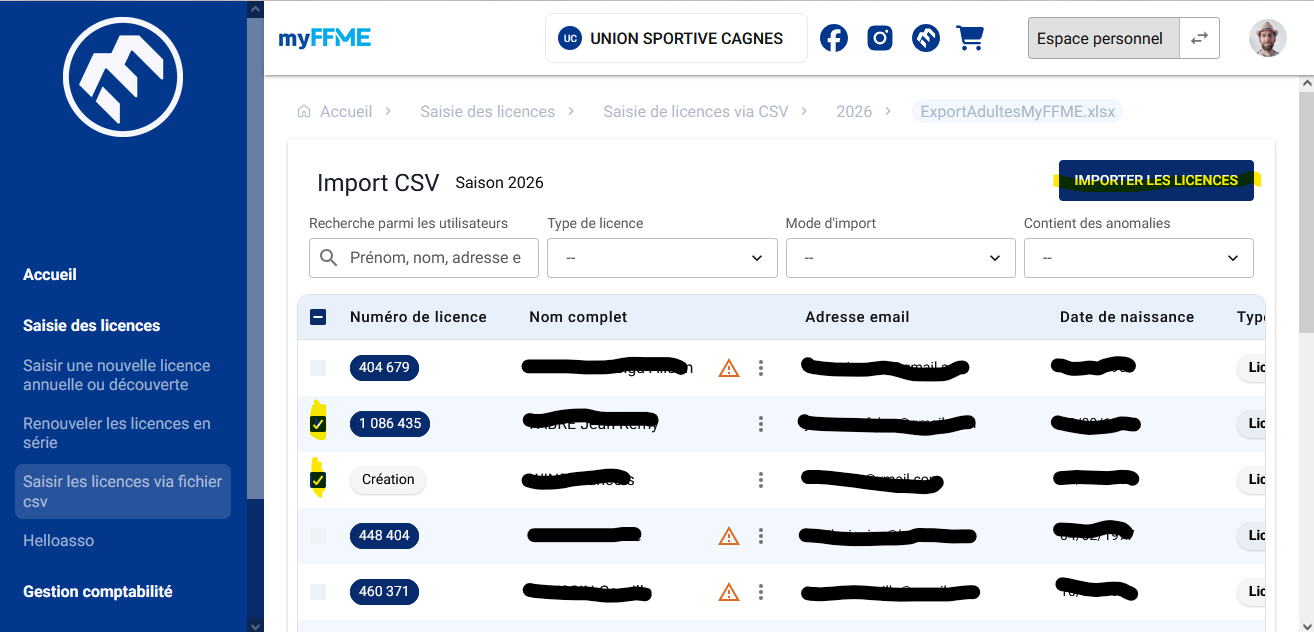 Cocher tous les licenciés à saisir (celles dont les fiches d’inscription se trouvent dans le dossier A saisir dans le Drive), cliquer sur le bouton Importer les licences et valider le paiement.