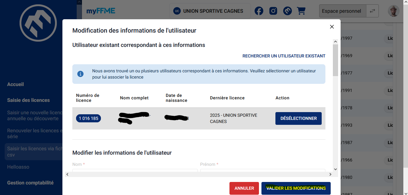 Corriger individuellement les licenciés à saisir avec un !